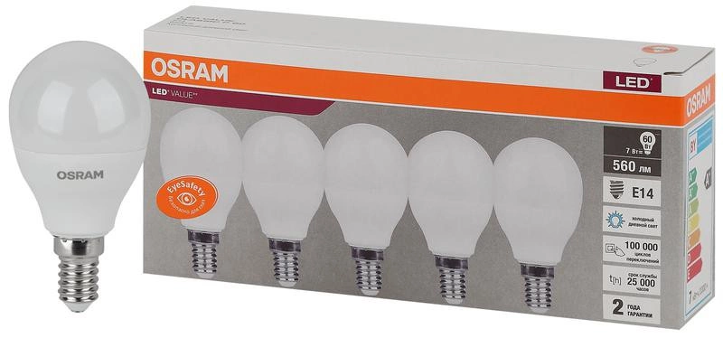 Полное описание: Лампа светодиодная LED Value LVCLP60 7SW/865 шар матовая E14 230В 2х5 RU (уп.5шт) OSRAM 4058075578166
