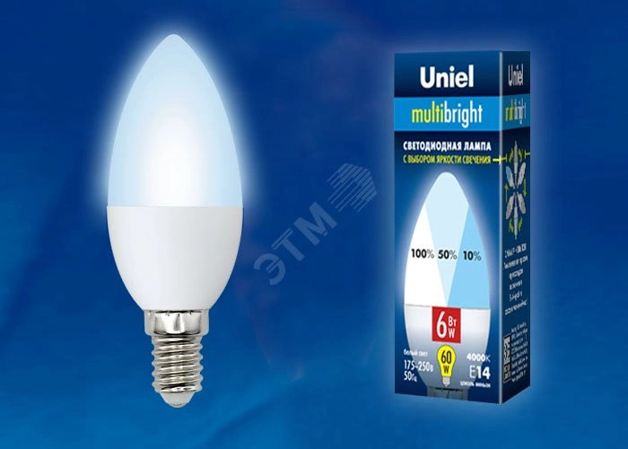 Лампа светодиодная с трехступенчатым диммером 100-50-10 LED 6вт 175-250В свеча 510Лм Е14 4000К Uniel Multibrigh