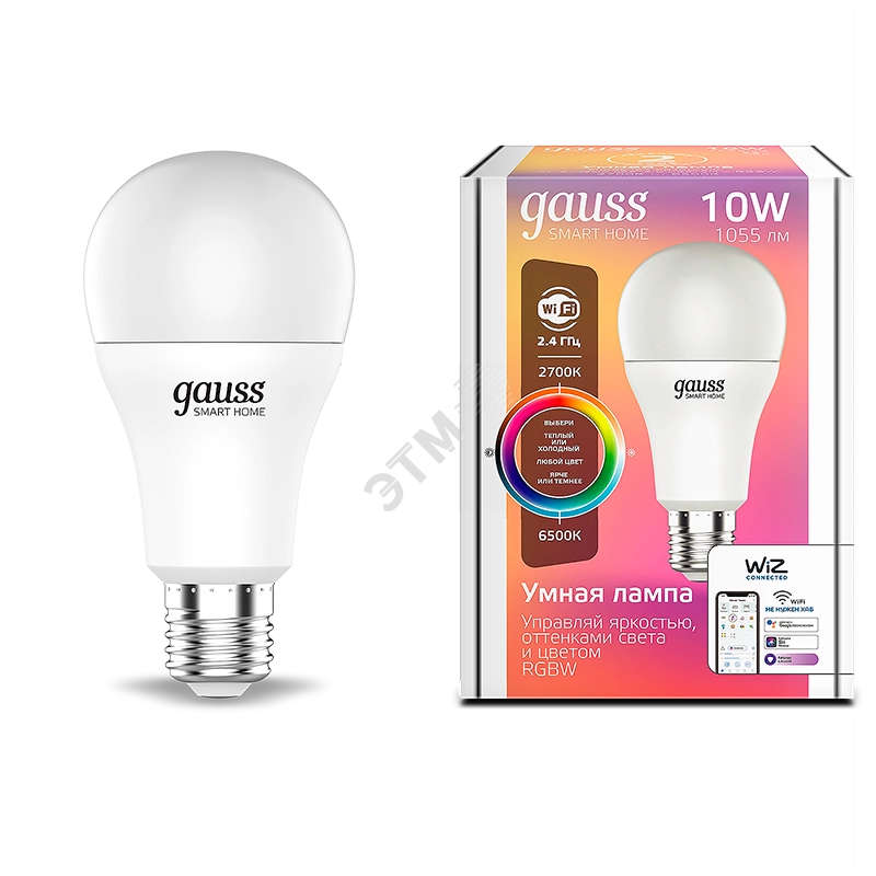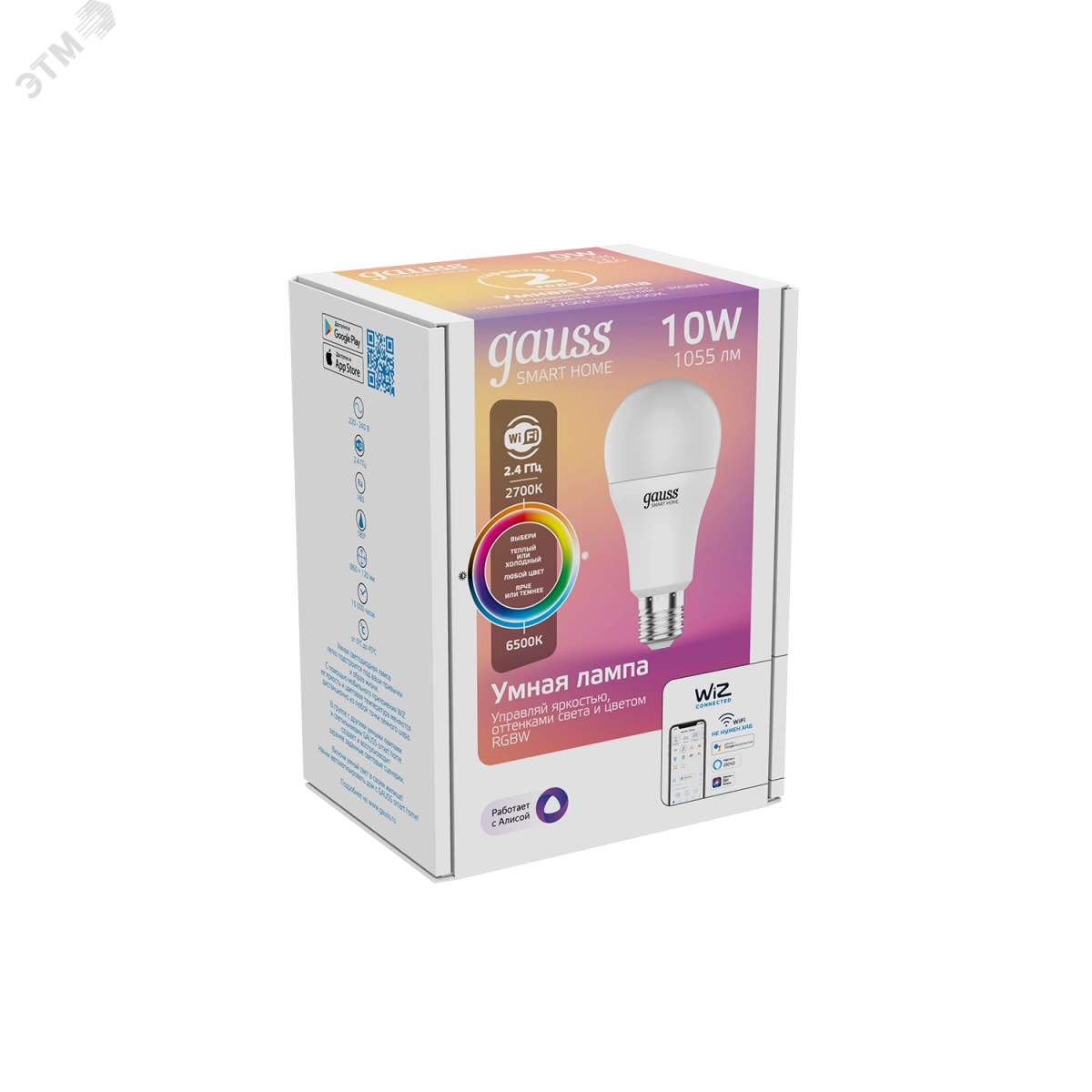 Умные' SMD лампы Gauss Smart Home тип RGBW представлены лампами А60 8,5 Вт, А60 10Вт и С37 5 Вт. Их световая температура может быть в диапазоне от 2700К до 6500К. Лампы способны светить всей широтой цветного спектра. Лампы управляются по Wi-Fi через приложение WiZ Connected и c помощью голосовых помощников Алиса и Маруся. Возможности автоматизации включают с себя расписания, 32 предустановленных режима освещения, суточные ритмы, плавное включение и отключение.
