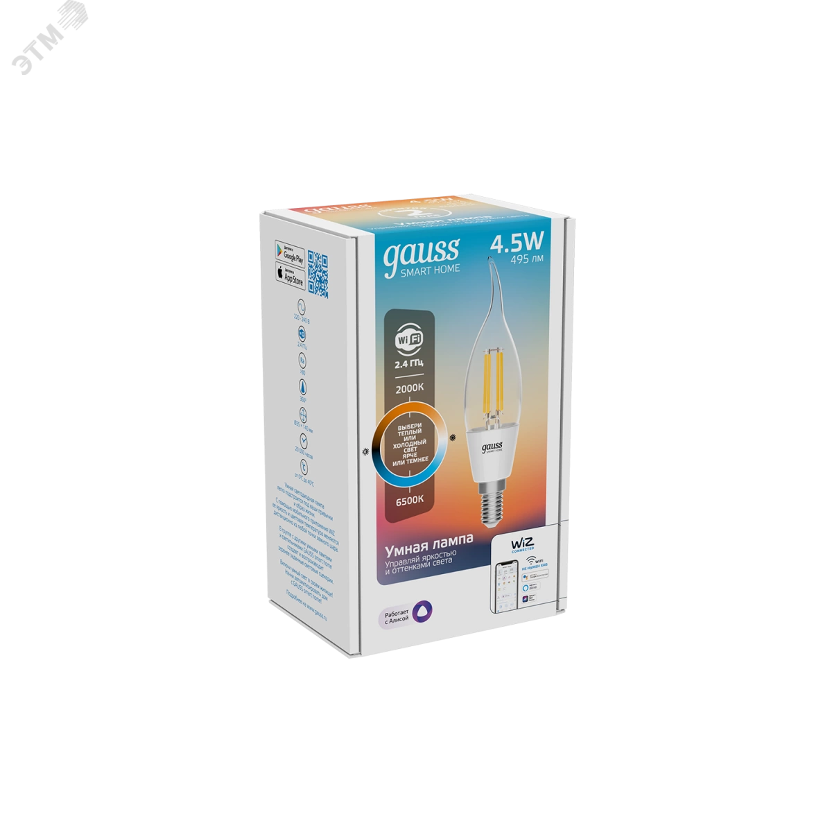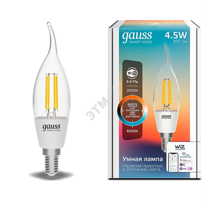 Лампа светодиодная умная LED 4.5 Вт 495 Лм 2000-6500К E14 свеча на ветру изм.цвет.темп.+дим. управление по Wi-Fi Smart Home Filament Gauss