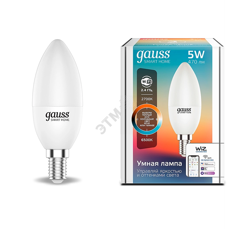 Умные' SMD лампы Gauss Smart Home тип ССТ+DIM представлены лампами А60 8,5 Вт, А60 10Вт и С37 5 Вт. Их световая температура может быть в диапазоне от 2700К до 6500К. Лампы управляются по Wi-Fi через приложение WiZ Connected и c помощью голосовых помощников Алиса и Маруся. Возможности автоматизации включают с себя расписания, 14 предустановленных режимов освещения, суточные ритмы, плавное включение и отключение.
