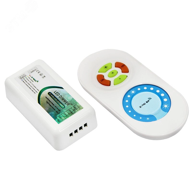 Беспроводной одноканальный диммер 2.4G для одноцветных светодиодных лент. Регулирование яркости от 1 до 100 %. Действие пульта ДУ до 30 м. Возможность управления с iOS (опционально). DC 12-24 V, 6 A. 12 V <72 W. 24 V <144 W. Для подключения большего количества ленты можно использовать несколько диммеров одновременно. Пульт имеет возможность привязки к нескольким блокам диммера, чтобы синхронно управлять ими.Также возможен вариант использования усилителя сигнала, в качестве которого подойдет и трехканальный (RGB) усилитель. В таком случае все каналы стоит объединить (замкнуть).