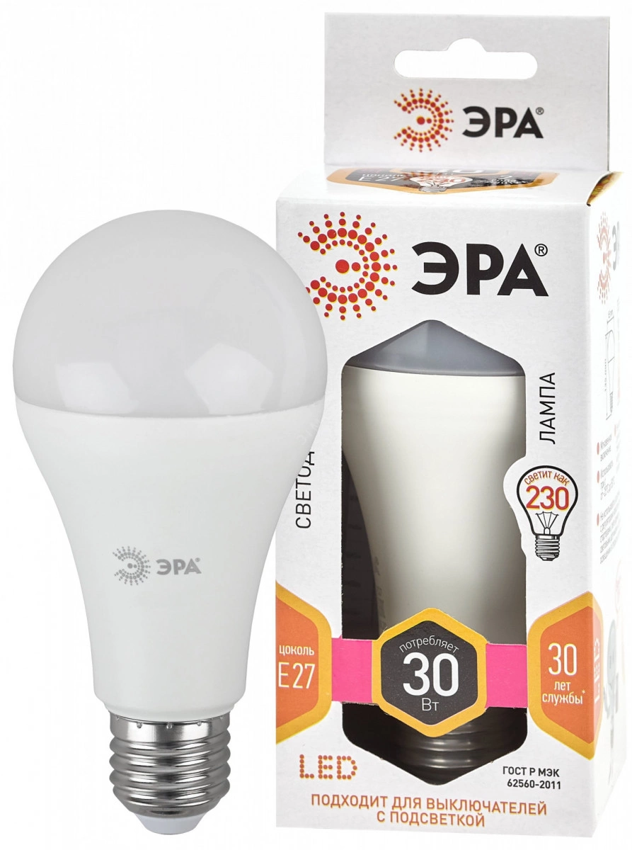 LED лампа A65-30W-827-E27 ЭРА (диод, груша, 30Вт, тепл, E27) (10/100/1200)