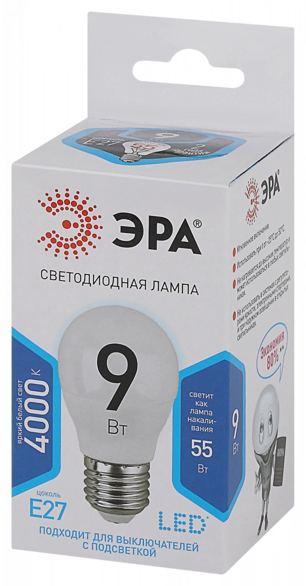 LED P45-9W-840-E27 ЭРА (диод, шар, 9Вт, нейтр, E27) (10/100/3600)