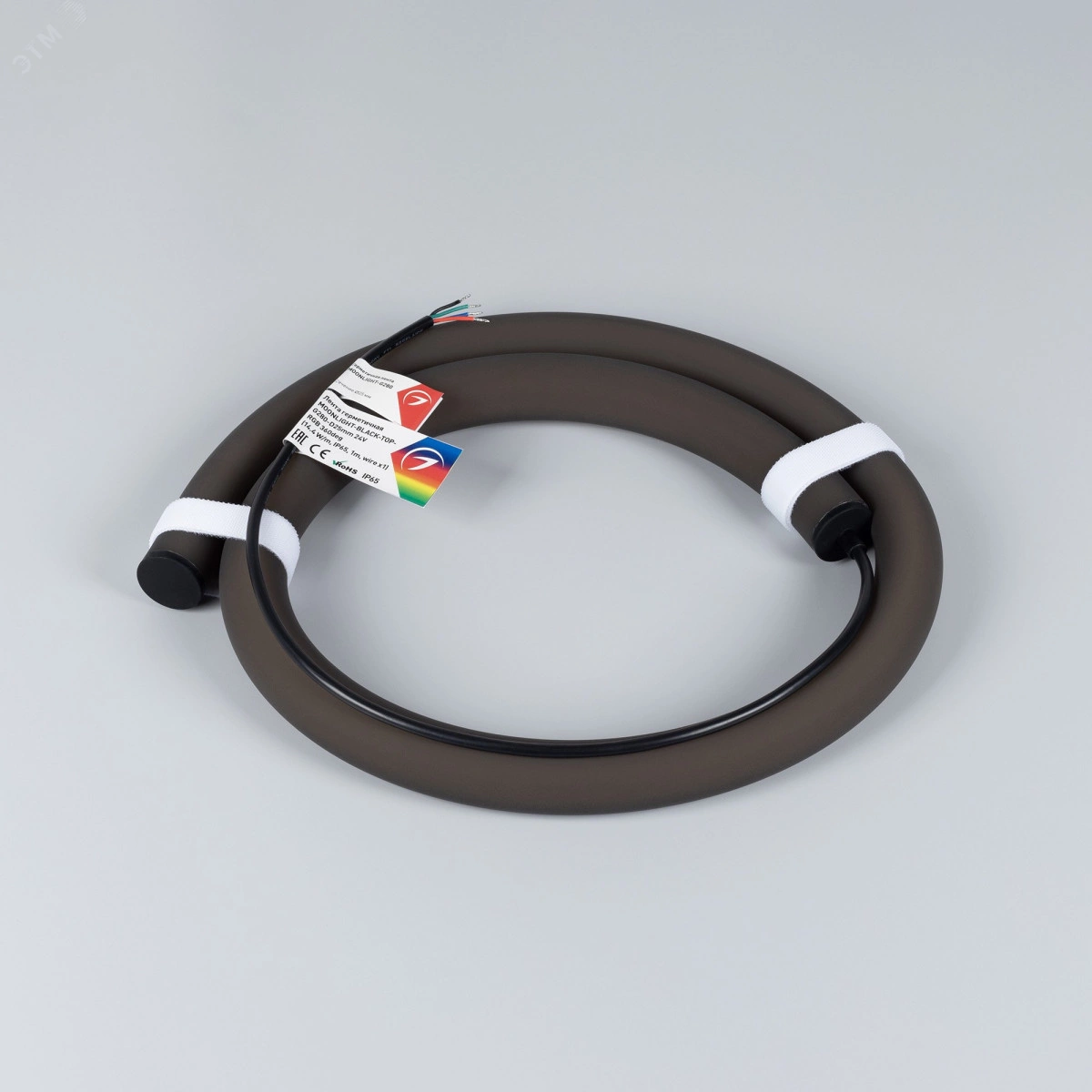 Гибкая герметичная лента MOONLIGHT чёрного цвета. Имеет круглое сечение 25x25 мм и оснащена 280 светодиодами SMD3838 на метр. Возможность изменять цвет ленты (RGB) позволяет подобрать нужный оттенок для вашего освещения. Угол излучения ленты составляет 360 град., что позволит создавать с ее помощью уникальные элементы декора. Лента потребляет всего 14,4 Вт/м и работает от 24 V. Она обладает классом пылевлагозащиты IP65, что позволяет использовать ленту в т.ч. во влажных помещениях, и имеет минимальный радиус изгиба 120 мм. Габариты ленты составляют 5000x25x25 мм. Кабель питания длиной 500 мм выводится с одной стороны вдоль линии сечения ленты. Упаковка содержит 1 м ленты. Гарантия на ленту составляет 3 года.