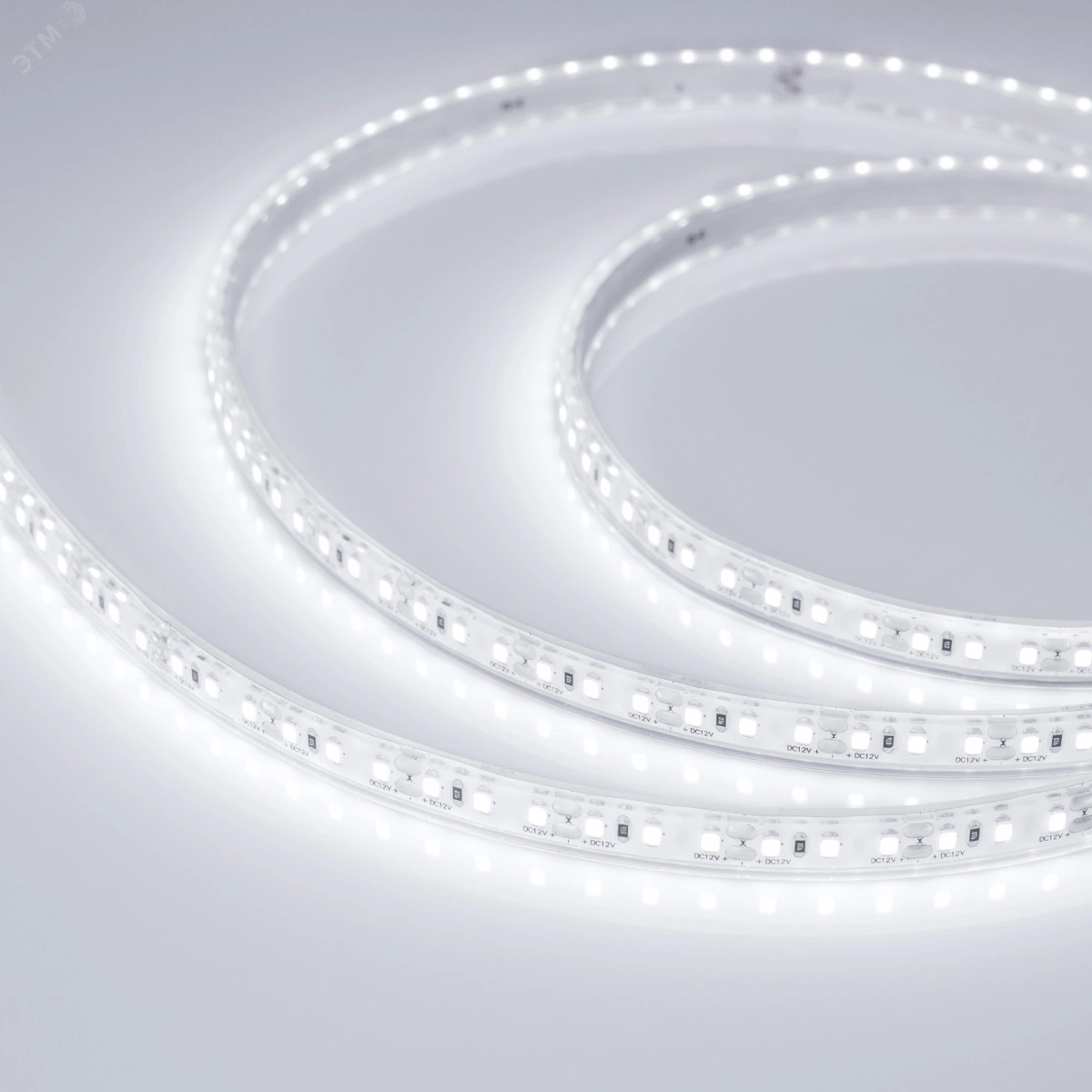 Светодиодная лента RTW-PU-A120, герметичная IP68 (PU-сплошной полиуретан), подходит для использования под водой на глубине до 2м. Светодиоды 2835, 120 шт/м (600 шт на 5 м), белая плата, ширина 10.5 мм. Цвет БЕЛЫЙ 6000 K, цветопередача CRI-90, угол 120 градусов . Питание 12V, мощность 16.8 Вт/м (84 Вт на 5 м). Размеры 5000x10.5x5.6 мм. Мин. отрезок 25 мм, 3 светодиода. Лента крепится с помощью скоб, скобы идут в комплекте (5шт), 3M скотч отсутствует.