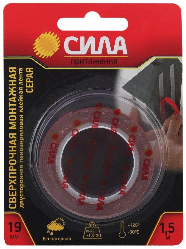 Лента клейкая сверхпрочная монтажная SDST-1915GR двустор. пеноакрил.19мм х 1.5м сер. СИЛА Б0046372