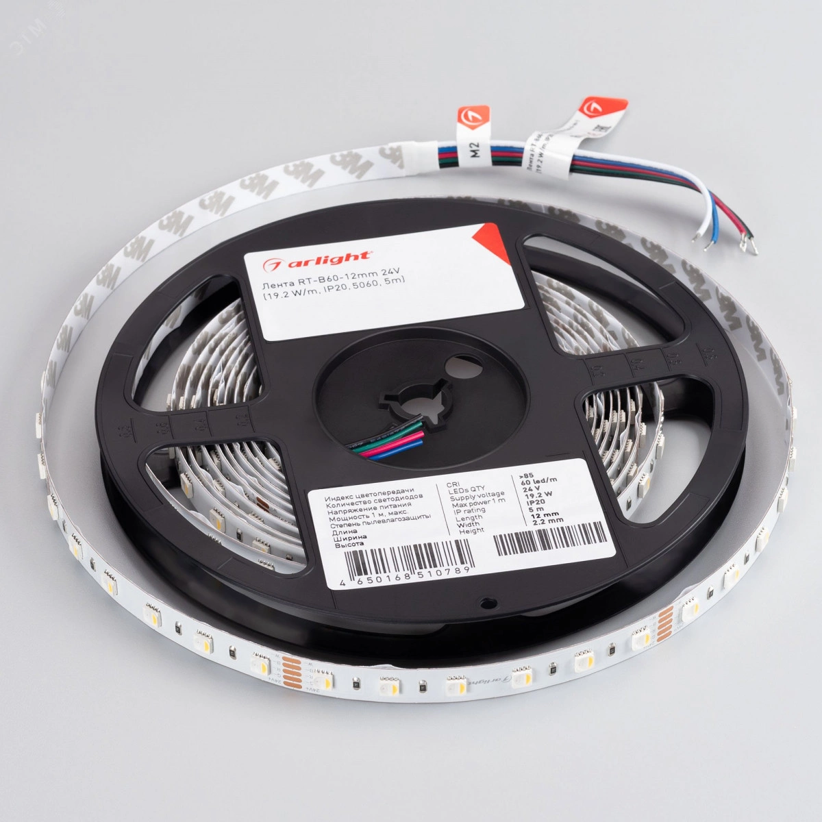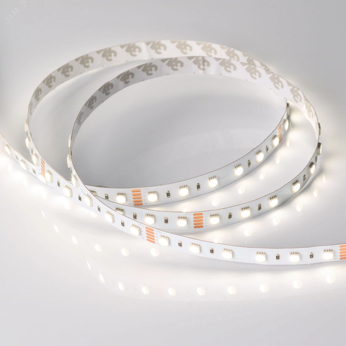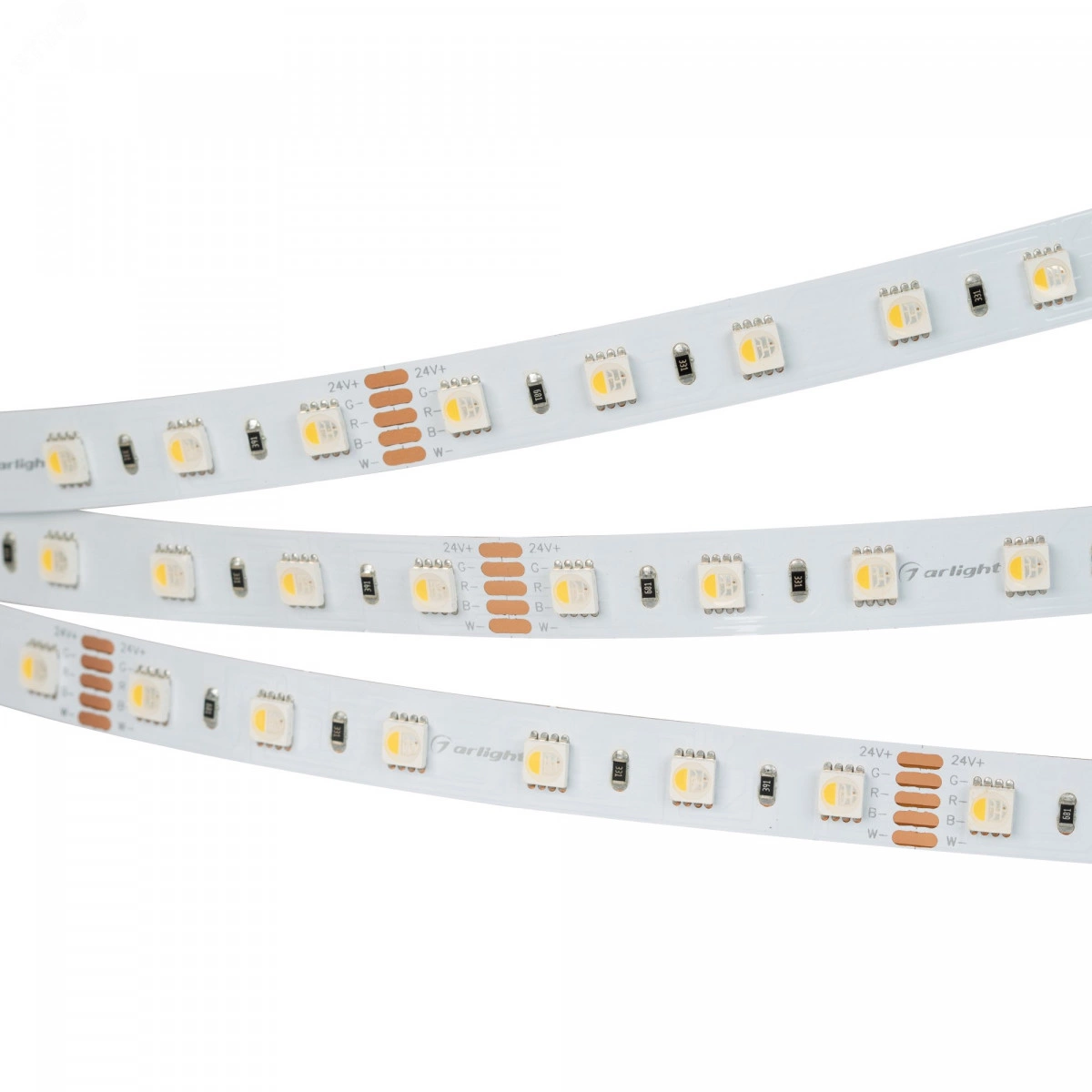 Светодиодная лента RT-B60, открытая. Светодиоды 5060 4-in-1, 60 шт/м (300 шт на 5 м), белая плата, ширина 12 мм, скотч 3M. Цвет RGB плюс ДНЕВНОЙ 4000 K, цветопередача CRI-85, угол 120 градусов . Питание 24V, мощность 19.2 Вт/м (96 Вт на 5 м). Размеры 5000x12x2.2 мм. Мин. отрезок 100 мм, 6 светодиодов.