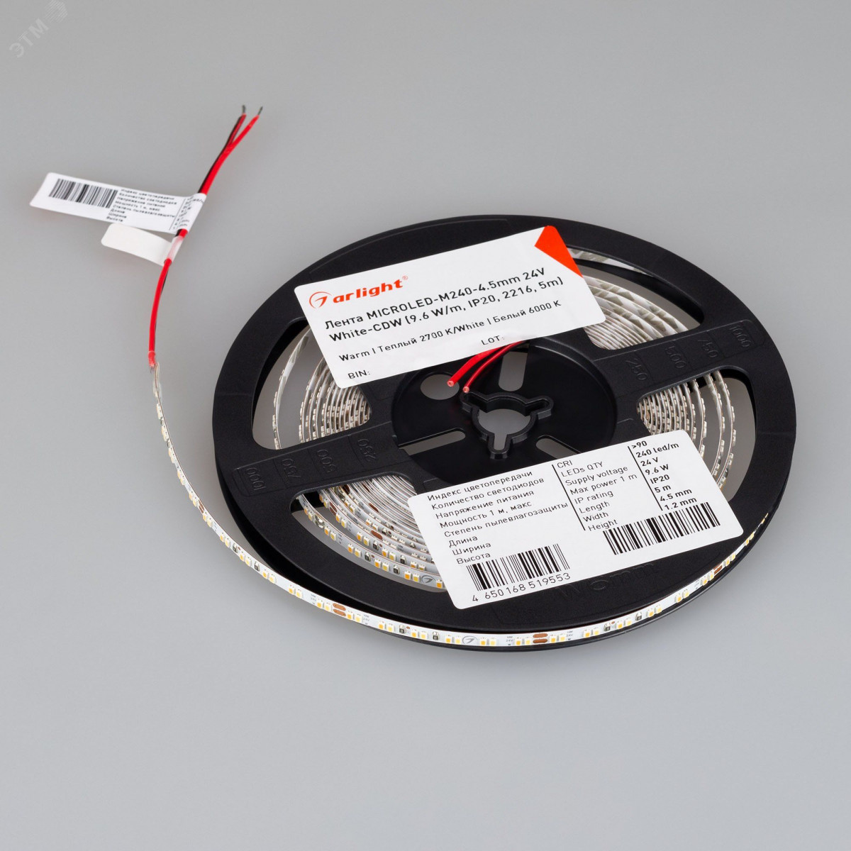 Биполярная светодиодная узкая лента MICROLED-M240 с изменяемой цв.температурой, открытая. Светодиоды 2216, 240 шт/м (1200 шт на 5 м), белая плата, ширина 4.5 мм, скотч 3M. Цвет MIX БЕЛЫЙ 6000 K плюс ТЁПЛЫЙ 3000 K, цветопередача CRI-90, угол 120 градусов . Питание 24V, мощность 9.6 Вт/м (48 Вт на 5 м). Размеры 5000x4.5x1.2 мм. Мин. отрезок 50 мм, 12 светодиодов.