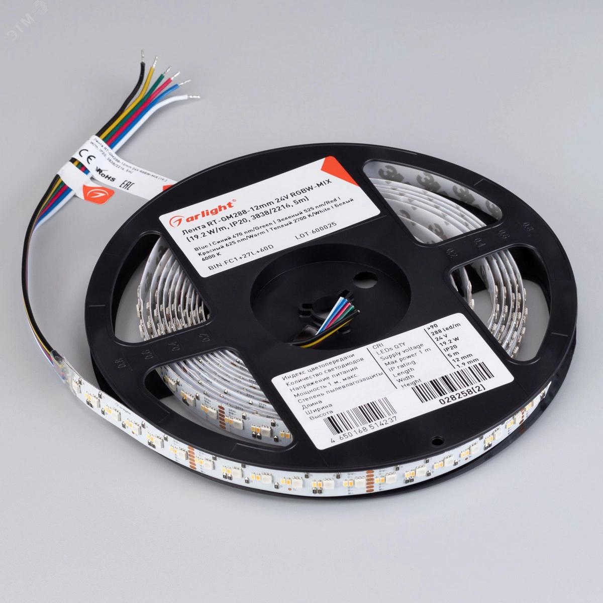 Светодиодная лента 5-в-1 RT-GM288, открытая. Светодиоды 3838/2216, 288 шт/м (1440 шт на 5 м), белая плата, ширина 12 мм, скотч 3M. Цвет RGBW-MIX, цветопередача CRI-90, угол 120 градусов . Питание 24V, мощность 19.2 Вт/м (96 Вт на 5 м). Размеры 5000x12x1.9 мм. Мин. отрезок 62.5 мм, 18 светодиодов.