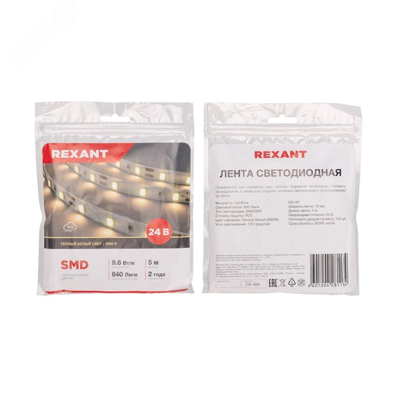 Лента светодиодная 24В SMD2835 9,6Вт/м 120LED/м 3000K 10мм 5м IP20