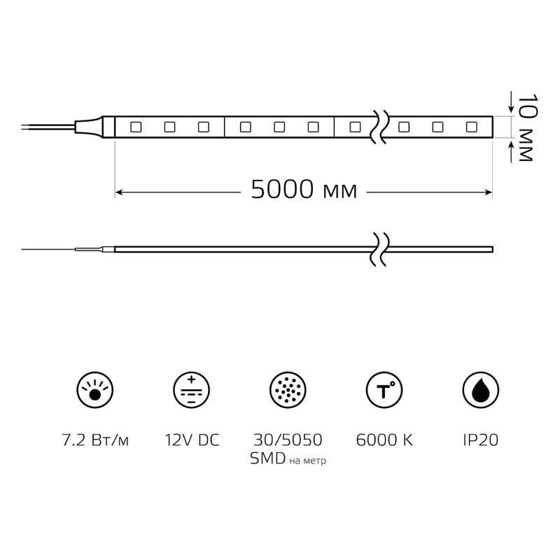Лента светодиодная Elementary 5050/30-SMD 7.2Вт/м 6500К холод. бел. IP20 250лм/м 12В 10мм (уп.5м) GAUSS 355000307