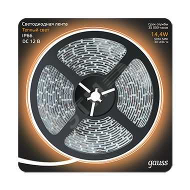 Лента со светодиодами SMD 5050 высокой яркости. Светодиодные ленты Gauss Black - долгий срок службы и надежность. Основой является двухслойная плата с токопроводящими дорожками из чистой меди. Это позволяет снизить нагрев ленты при прохождении тока и увеличить срок службы светодиодов. Лента серии Black имеет увеличенный срок службы 35000 часов.