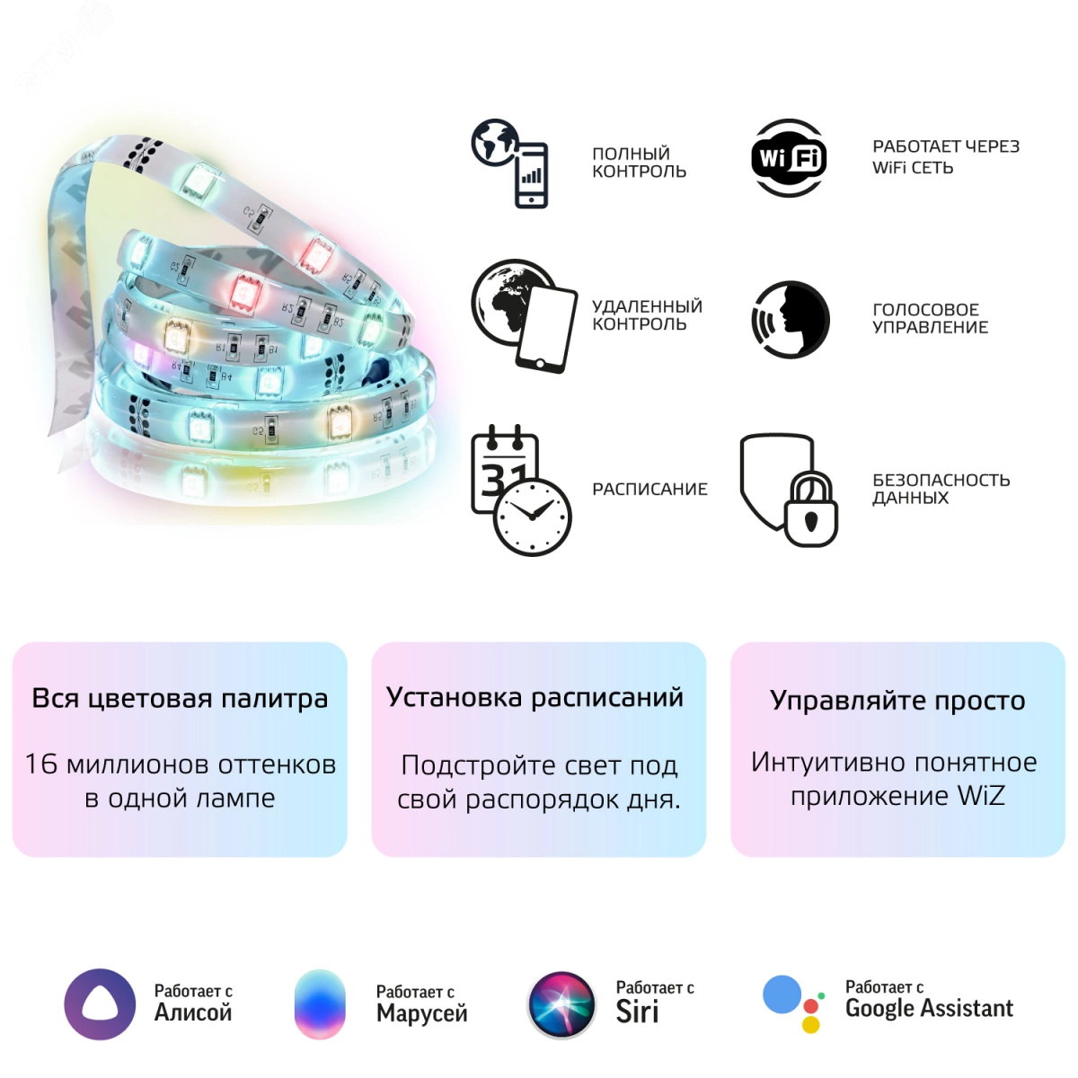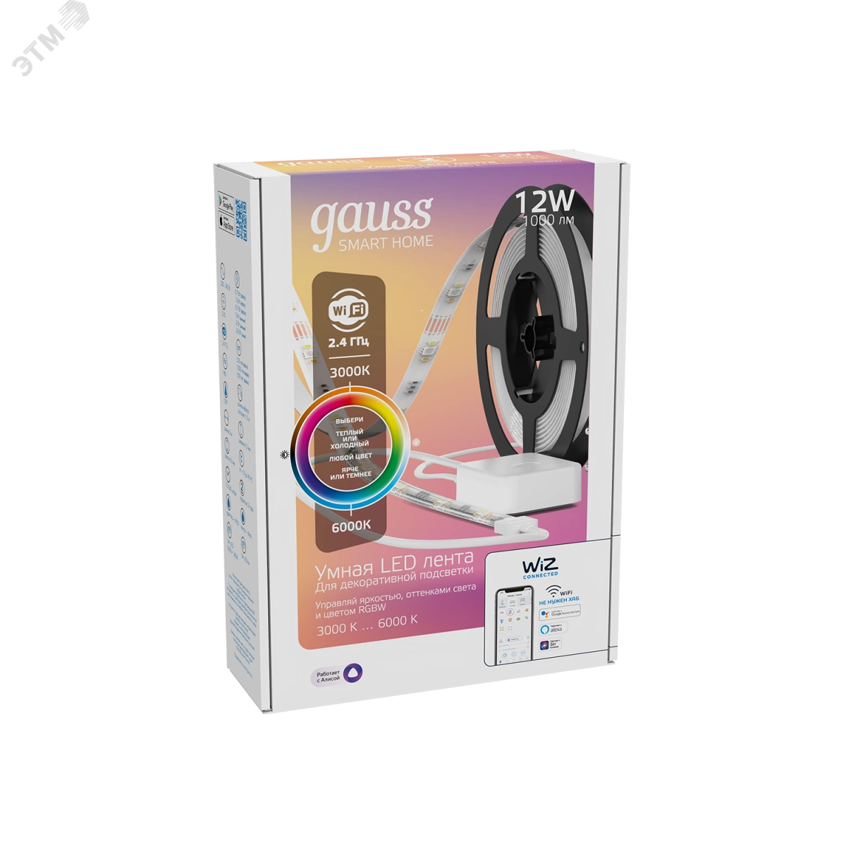 Умная Wi-fi светодиодная лента Gauss Smart Home RGBW, длина 3м, 3000-6000K, диммируемая с изменением цвета, управление голосом/смартфоном. Дистанционное управление - управляйте светом через мобильное приложение или голосовой помощник (Алиса, Siri, Google, Маруся). Миллионы оттенков - вы можете выбрать любой оттенок цветовой палитры, который подойдет под ваше настроение. Установка расписаний - автоматизируйте пространство. Свет будет включаться и выключаться по вашему расписанию. Режимы - динамические режимы созданы в Париже специалистами по световым решениям. Сцены - зафиксируйте понравившийся режим в сцене и включайте одним кликом на смартфоне. Помимо ленты в ассортименте бренда представлены и другие умные устройства, среди которых датчик движения, розетка, светодиодные и филаментные лампы, а также встраиваемые и накладные светильники.