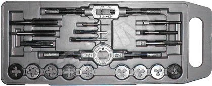 Для тонкостенных стальных труб и труб из цветных металлов. В наборе - метчикодержатель, плашкодержатель, 9 метчиков и 9 плашек(М3 x 0,5, М4 x 0,7, М5 x 0,8, М6 x 1,0, М7 x 1,0,М8 x 1,25, М10 x 1,5, М12 x 1,75, 1/8NPT). Материал - легированная инструментальная сталь. Упаковка -пластиковый чемодан.