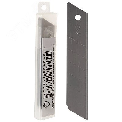 В упаковке - 10 шт. Размер - 25х100мм, толщина - 0,7 мм. Материал - сталь. Упаковка - пластиковый бокс с подвесом. Лезвие состоит из нескольких сегментов, каждый из которых имеет свою режущую кромку. Если лезвие затупилось, то, обломив один сегмент, можно продолжить работу новой режущей кромкой.
