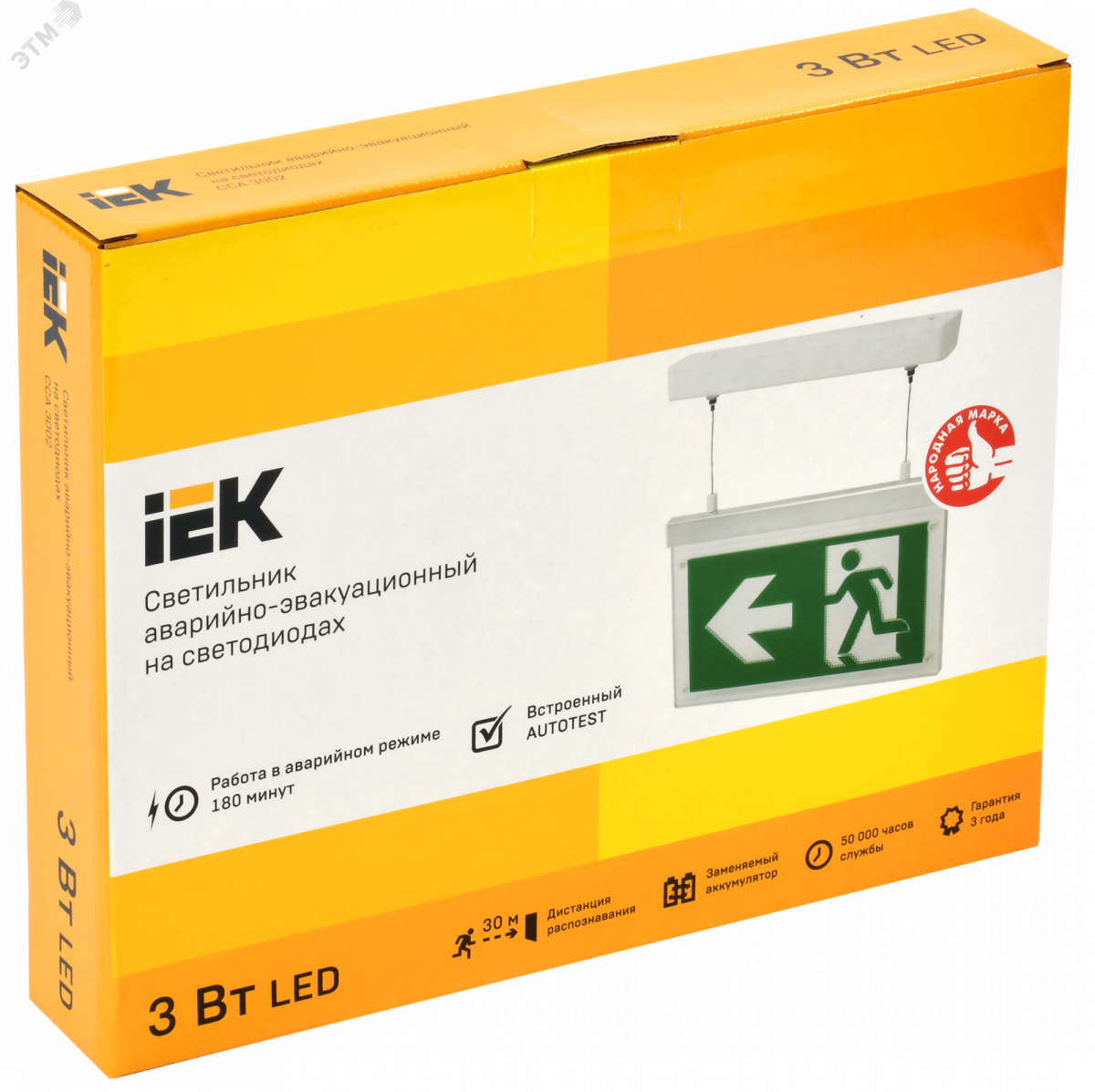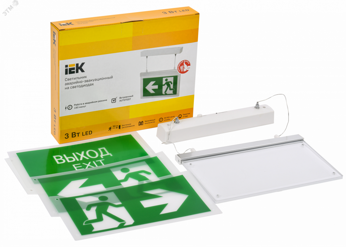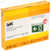 Двусторонний эвакуационный светильник с возможностью смены знака.|Три сменных знака в комплекте - выход, выход налево, выход направо.|Дистанция распознавания знака свыше 30 метров.|Средняя яркость знака - не менее 200 кд/м2.