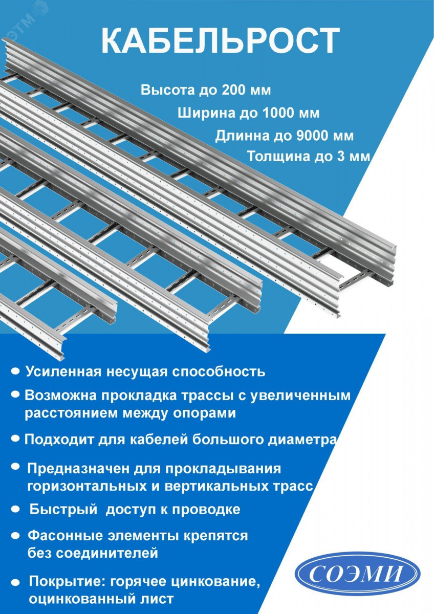 Лотки лестничные серии ''Кабельрост'' СОЭМИ — это усиленные лотки лестничного типа с высокой несущей способностью, как правило, промышленного назначения. С помощью лотков кабельростов возможна прокладка кабельной трассы с увеличенным расстоянием между опорами до 9 метров. Применяются для прокладки проводов в кабельных эстакадах, в тоннелях, а также, внутри помещений. Данное изделие изготовлено из стали с покрытием горячий цинк. Имеет следующие габаритные характеристики: толщина металла – 2 мм, длина – 3000 мм, высота – 200 мм. Соответствует климатическому исполнению: УТ1,5. Кабельрост прямой перфорированный РПП.600.200.3000.2.1 изготовлено согласно ТУ 25.11.23-029-05774835-2022. При необходимости изменения направления и разветвления трассы применяются фасонные элементы и различные аксессуары СОЭМИ.