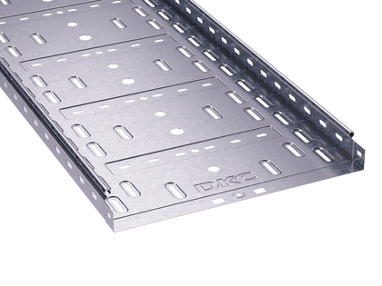 Перфорированные листовые лотки ДКС применяются для прокладки кабеля как в помещении, так и на открытом воздухе. Лотки отличаются высокой несущей способностью – подформовка, производимая при производстве этой продукции, создает дополнительное ребро жесткости, что увеличивает несущую способность системы до 54%. Перфорация сокращает вес конструкции. В лотках имеются отверстия для отвода кабеля диаметром 11 мм, 17 мм, 21 мм. Степень пыле- и влагозащиты перфорированных лотков – IP 10 при использовании крышек, входящих в состав системы. Метод соединения "мама-папа" применяемый для системы, существенно сокращает время монтажа и создает непрерывный контур. Конструктив листовых лотков ДКС предупреждает повреждение кабеля при прокладке. Толщина стали – 0,9 мм, высота лотка – 100 мм, ширина – 400 мм, длина – 3000 мм. Полезное сечение – 39500 мм. Исполнение – "сталь, оцинкованная по методу Сендзимира".