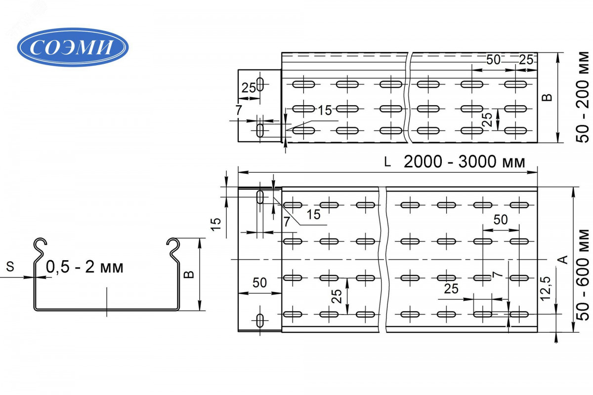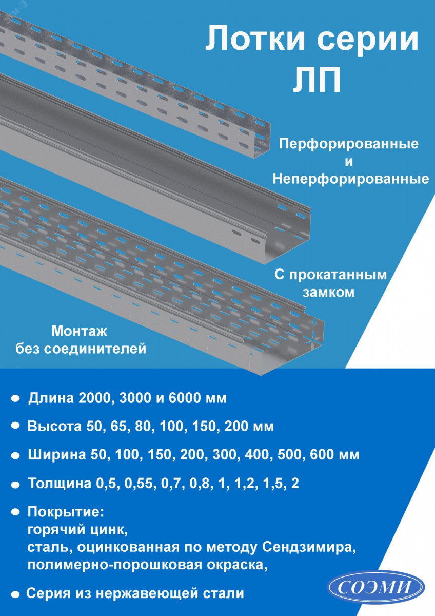 Лотки металлические монтажные серии ЛП - ''БЫСТРЫЙ МОНТАЖ'' завода СОЭМИ предназначены для открытой прокладки кабеля и кабельных линий напряжением до 1000В. Лотки изготавливаются двух модификаций: лотки монтажные прямые перфорированные монтаж без соединителей (ЛППМ) и лотки монтажные прямые неперфорированные монтаж без соединителей (ЛПНМ). Замковые лотки представляют из себя гнутый профиль с прокатанным замком для фиксации крышки. Конструкция монтажных лотков обеспечивает высокую защиту кабелей. Особенность данной серии система ''быстрый монтаж без соединителей''. Упрощенная система монтажа значительно ускоряет процесс установки и позволяет сократить расходы на материалы и трудозатраты. Изготовлены из стали с полимерно-порошковым покрытием. Соответствует климатическому исполнению: У2. При необходимости изменения направления и разветвления трассы применяются фасонные элементы и различные аксессуары СОЭМИ.