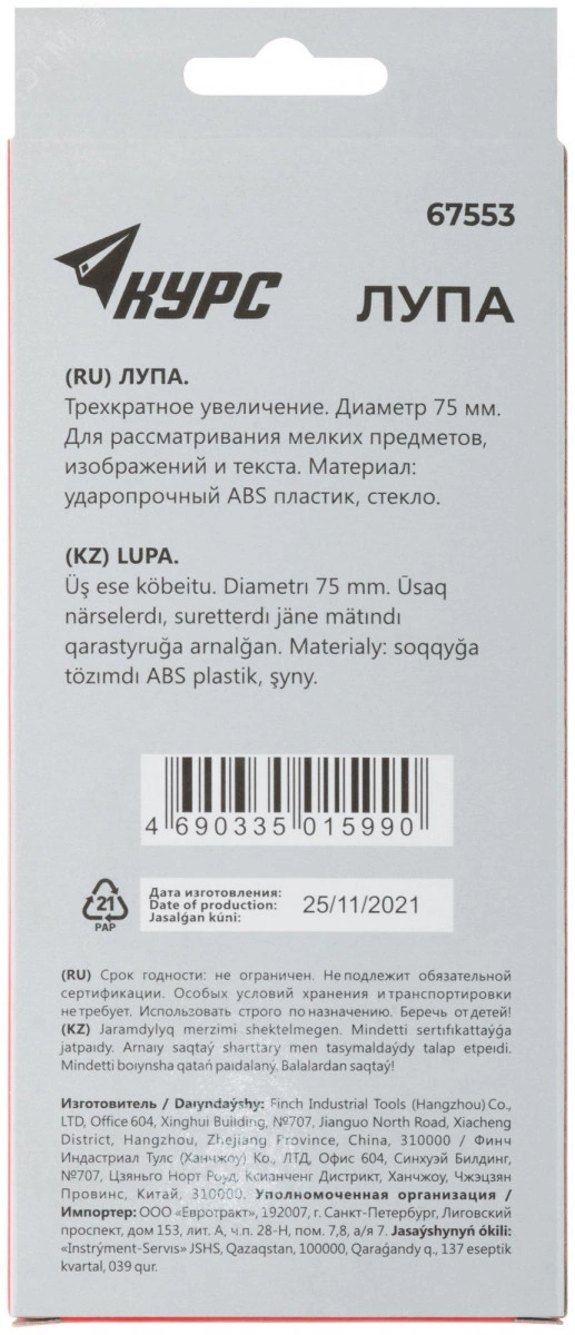 Лупа, пластиковый корпус. Упаковка - картонная коробка .