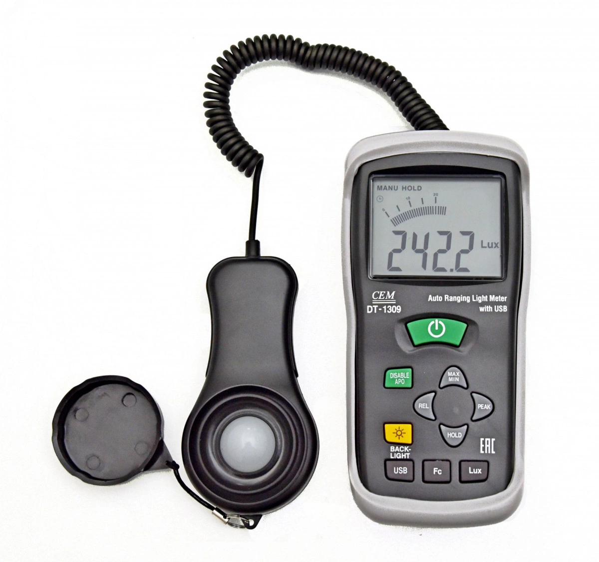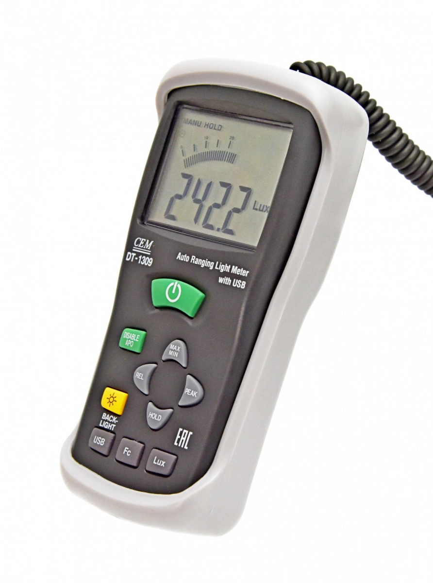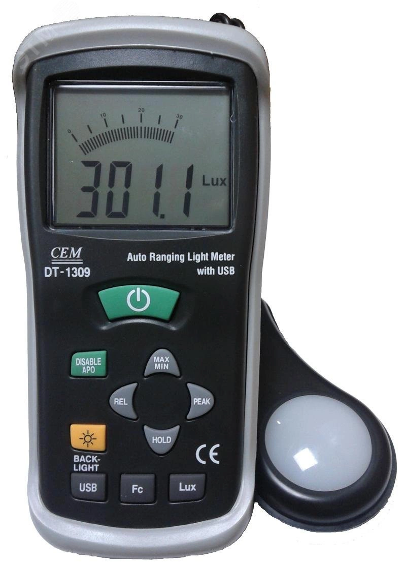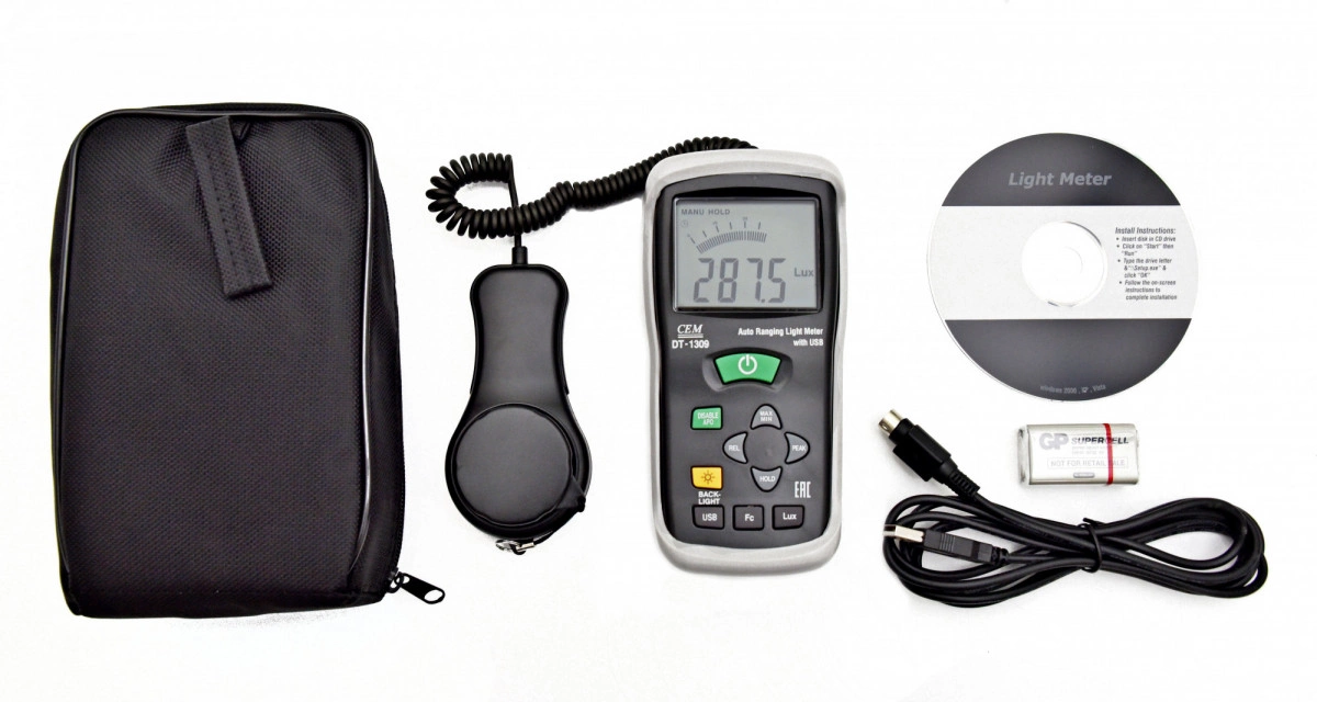 Измерение освещённости 400000Lux +-5. 0%, ЖК дисплей 4000 отсчетов, Выбор функции измерения FC/Lux регистрации пиковых значений PEAK HOLD, USB, ПО.