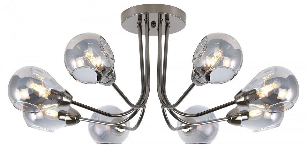 Люстры Elisabeth от итальянского бренда Rivoli привлекают внимание выдувными дизайнерскими плафонами нестандартной формы. Спешите купить эти стильные люстры потолочные с лаконичной арматурой оттенка черный жемчуг. Вас ждет европейский дизайн и качество материалов по доступной цене.Восемь грушевидных плафонов люстры Elisabeth изготовлены из дымчатого стекла. Большое количество ламп Е14 40 Вт возможность с успехом применять данные люстры для яркого освещения комнат площадью 24 м2. Идеальные люстры для просторной гостиной, квартиры-студии, загородного дома.