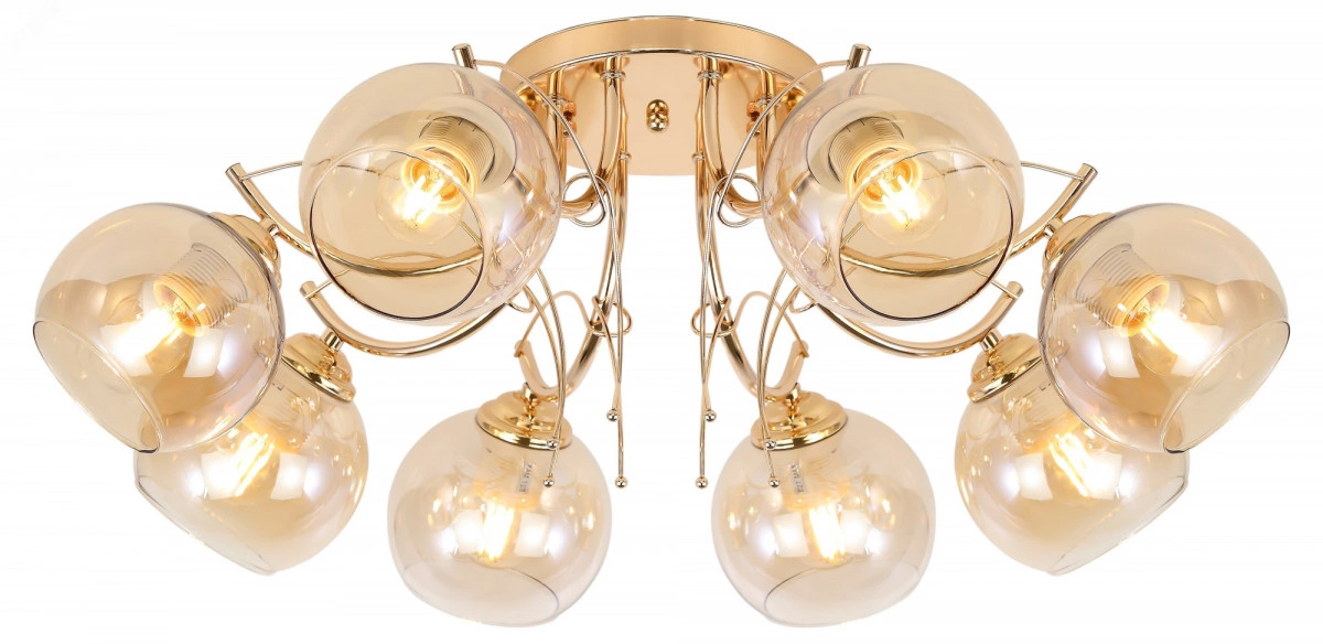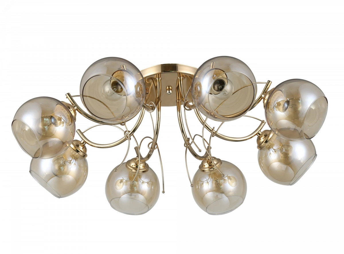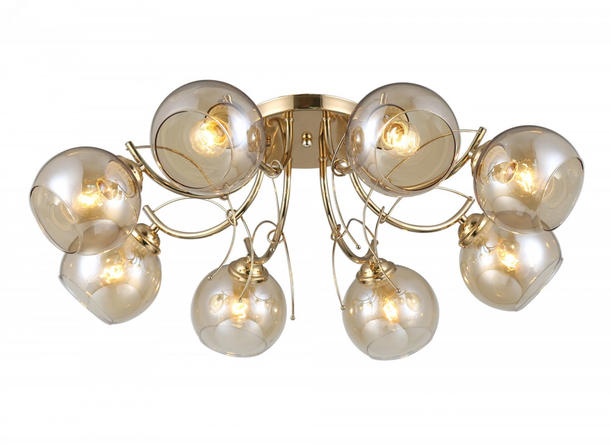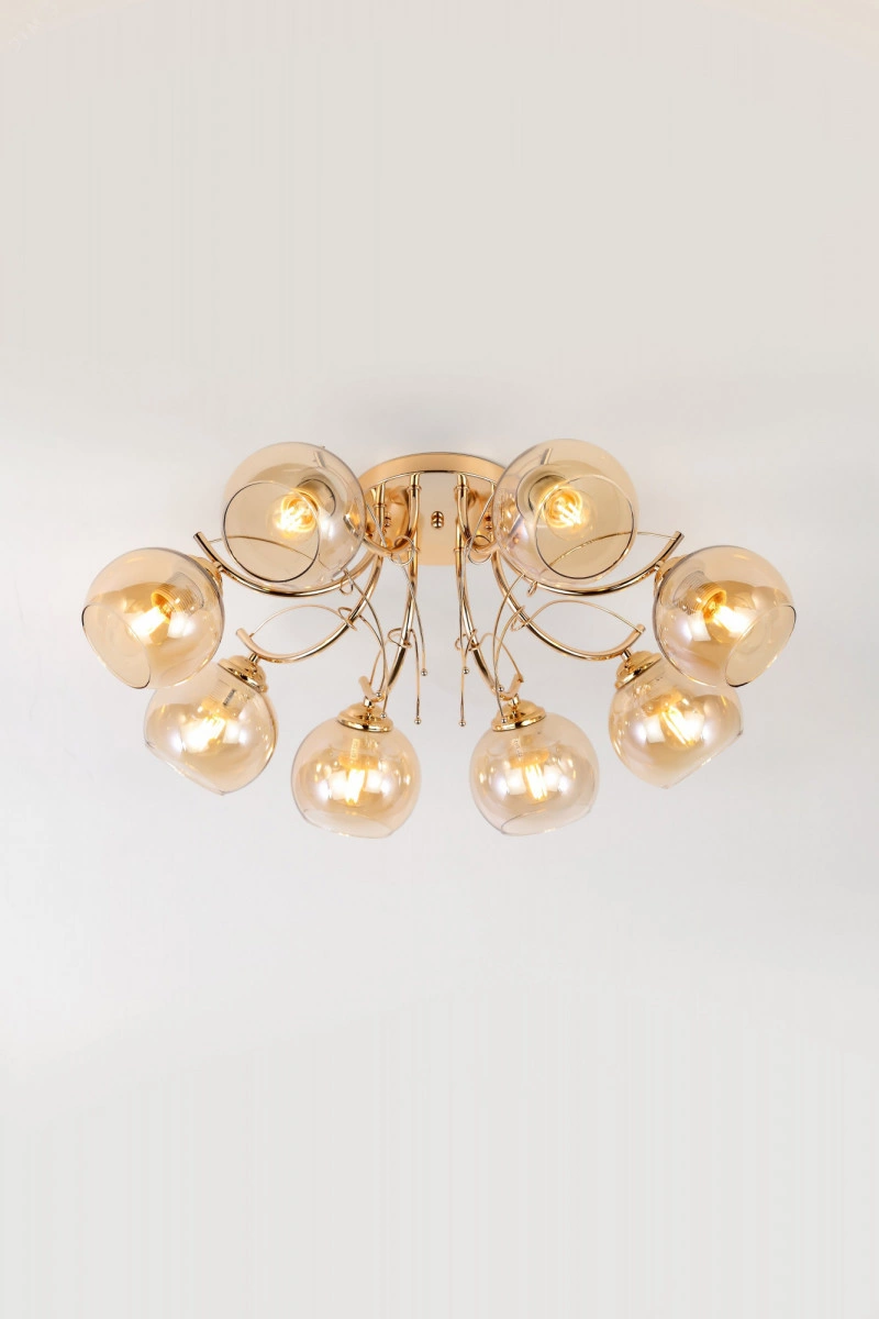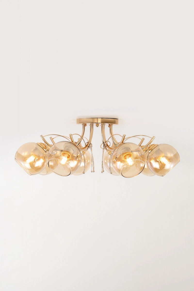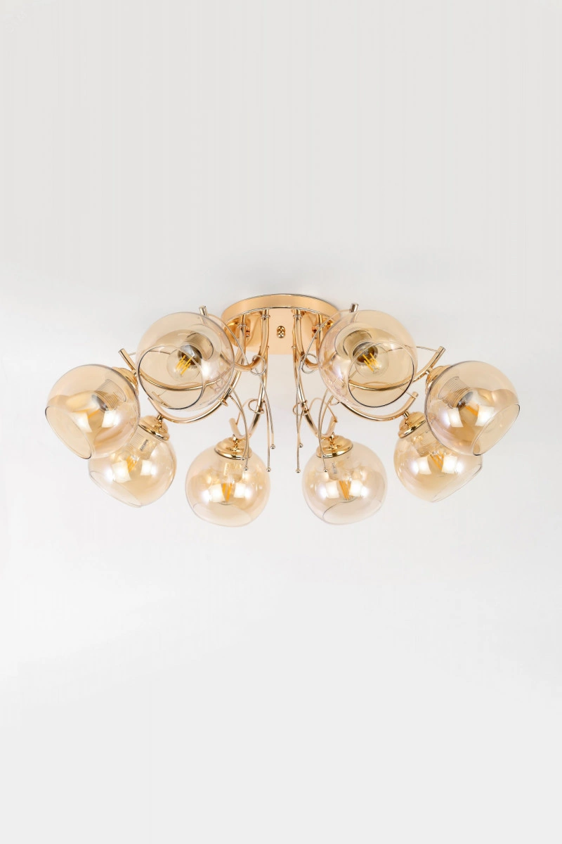 Люстра на потолок Elli от итальянского бренда Rivoli порадует теплым дизайном и качеством материалов. Изготовленная из прочного металла и тонированного декоративного стекла, эта люстра в большую гостиную не выцветет, не поцарапается и будет радовать вас долгие годы. Традиционные круглые плафоны и плавные линии металлических рожков люстры Elli создадут в спальне уютную атмосферу для отдыха и сна. Декоративные веточки золотого цвета оригинальная деталь этой красивой люстры в загородный дом. Корпус люстры Elli благородного золотого цвета защищен от выцветания и царапин стойким гальваническим покрытием. Тонкая арматура делает эти люстры невесомыми и уместными в интерьере практически любого стиля традиционного или современного.
