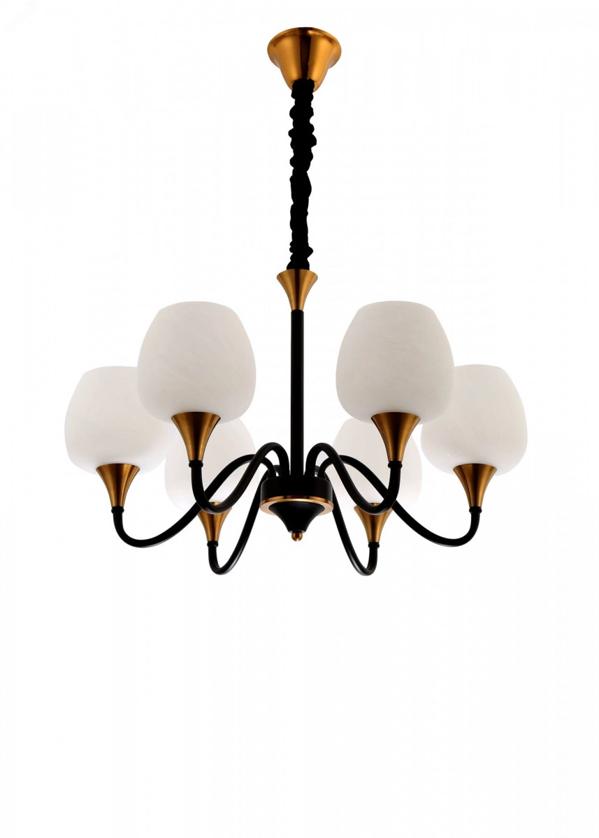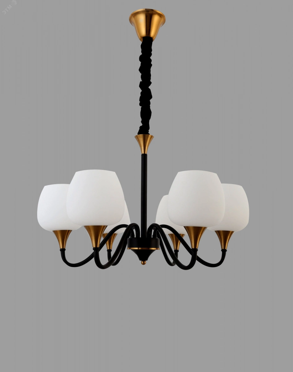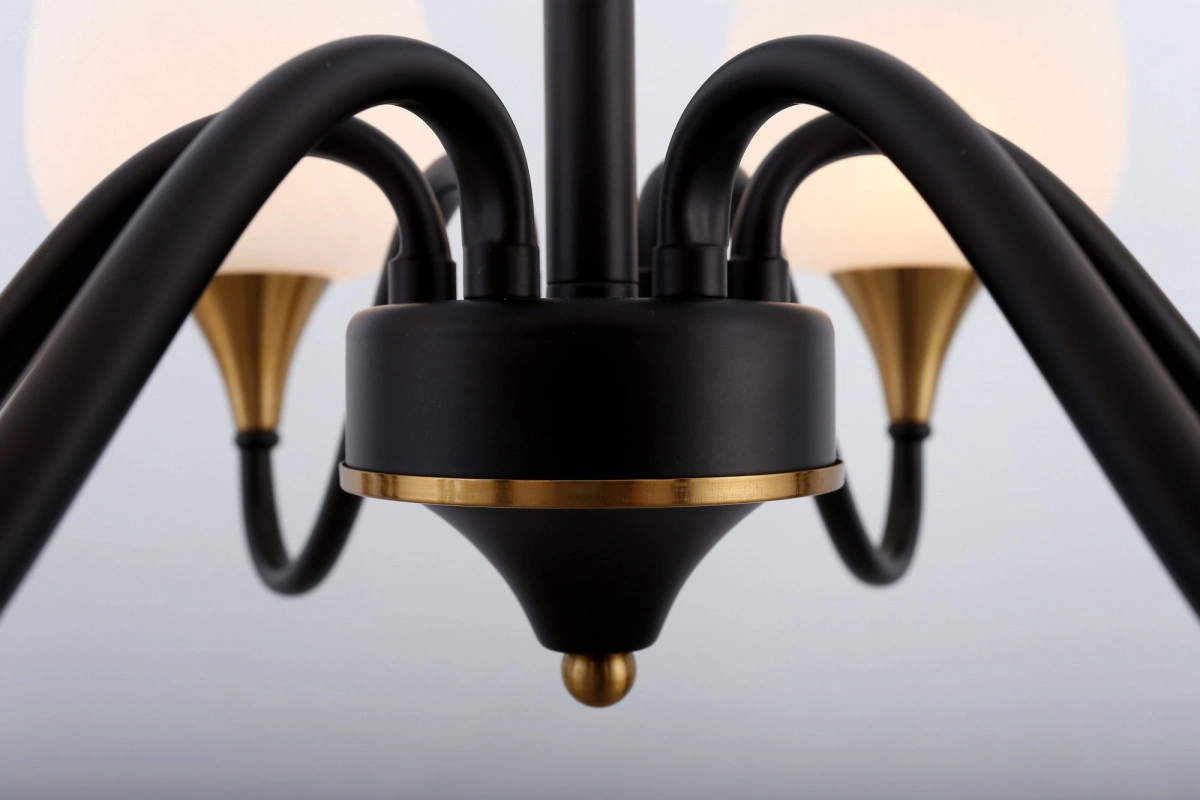 Опаловые плафоны смягчают свет, сочетание матового чёрного и античной бронзы выглядит дорого и презентабельно, миниатюрные детали успокаивают взгляд своей выразительной лаконичностью. Коллекция представлена 6-тирожковой подвесной люстрой на цепи.