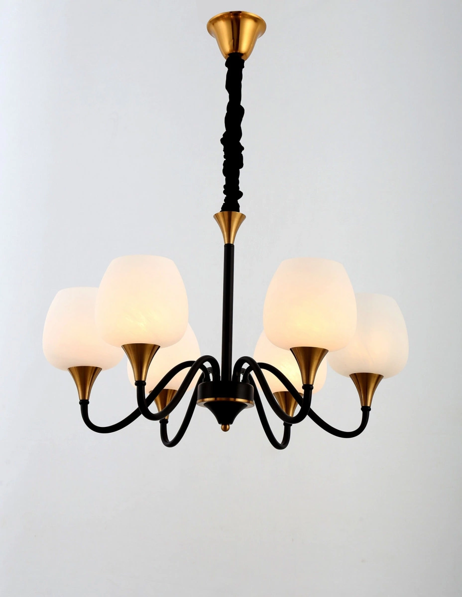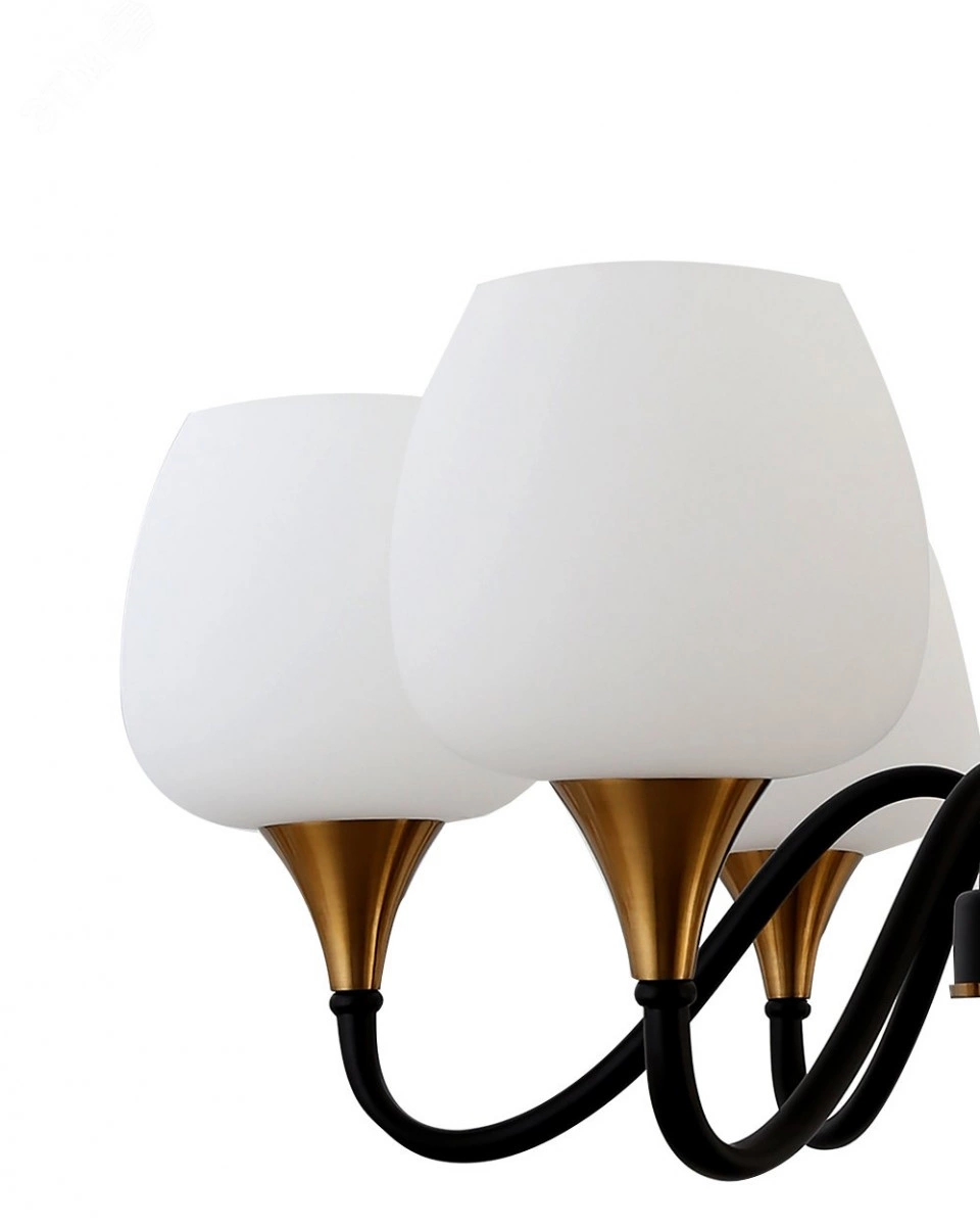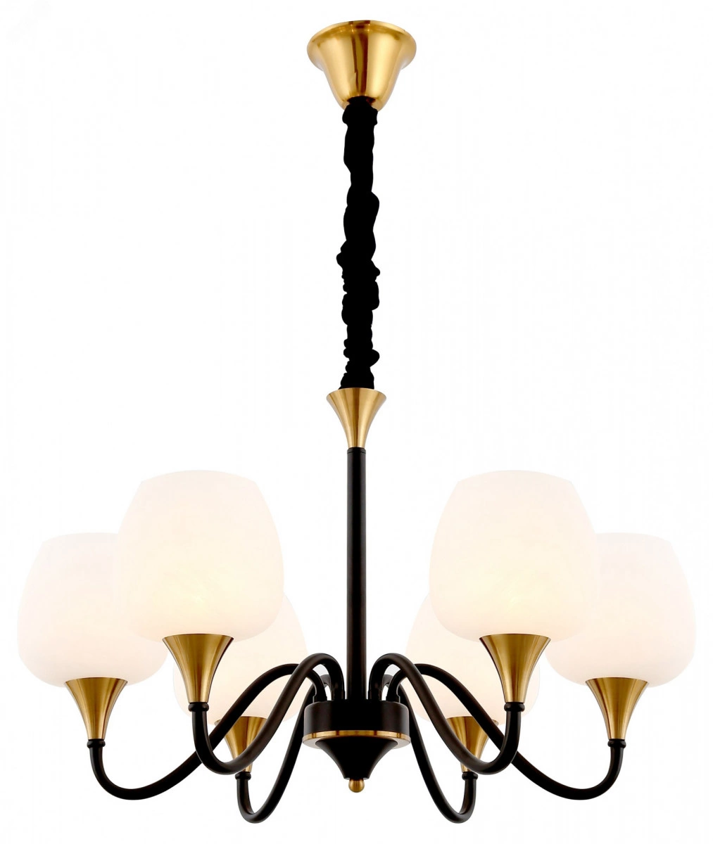 Опаловые плафоны смягчают свет, сочетание матового чёрного и античной бронзы выглядит дорого и презентабельно, миниатюрные детали успокаивают взгляд своей выразительной лаконичностью. Коллекция представлена 6-тирожковой подвесной люстрой на цепи.