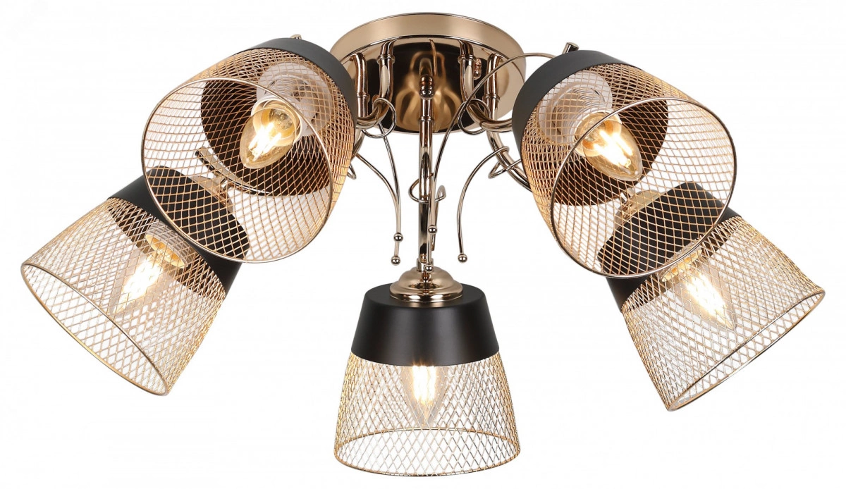 Хельма - древнее европейское женское имя. Серия люстр и подвесов Rivoli Helma, как и положено жительнице Европы, проста и самобытна, но в нужной ситуации может подчеркнуть свой лоск и благосостояние. Сетчатые плафоны на манер садовых плетеных абажуров покрыты золотистым напылением. Композицию уравновешивают сдержанные черные основания ламп. Коллекция представлена потолочной 5-ти рожковой люстрой.