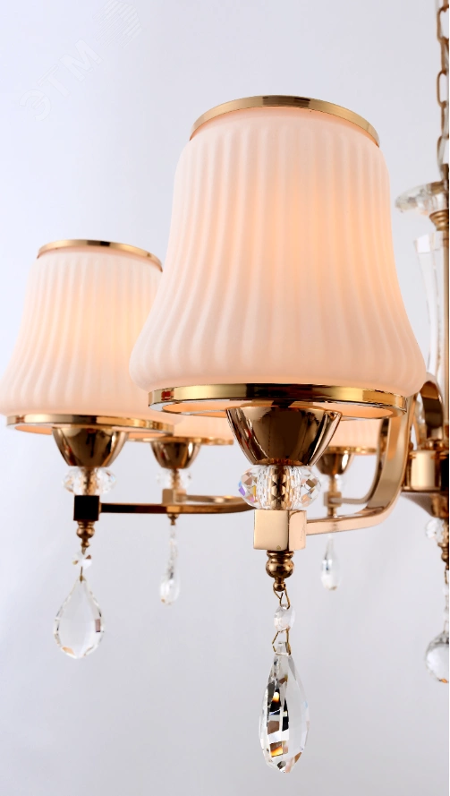 "Люстры потолочные Rivoli Herta стоит купить людям, которые ценят комфорт и ищут светотехнику с оптимальным сочетанием цены и качества. Выполненные в классическом стиле, эти большие 8-рожковые люстры имеют множество ""изюминок"", придающих им самобытность. Вам понравятся необычные линии арматуры, рельефные стеклянные плафоны, декорирование хрустальными элементами. Металлический корпус люстр на потолок Herta окрашен в необычный цвет французское золото этот тёплый оттенок настраивает на позитивный лад. Благодаря матовым плафонам люстры Herta станут хорошим решением для спальни свет будет мягким и равномерным, без бликов, приятным для отдыха и подготовки ко сну. Подвесные люстры Rivoli Herta в гостиной, столовой или загородном доме актуальны благодаря большой освещаемой площади 24 м2. "