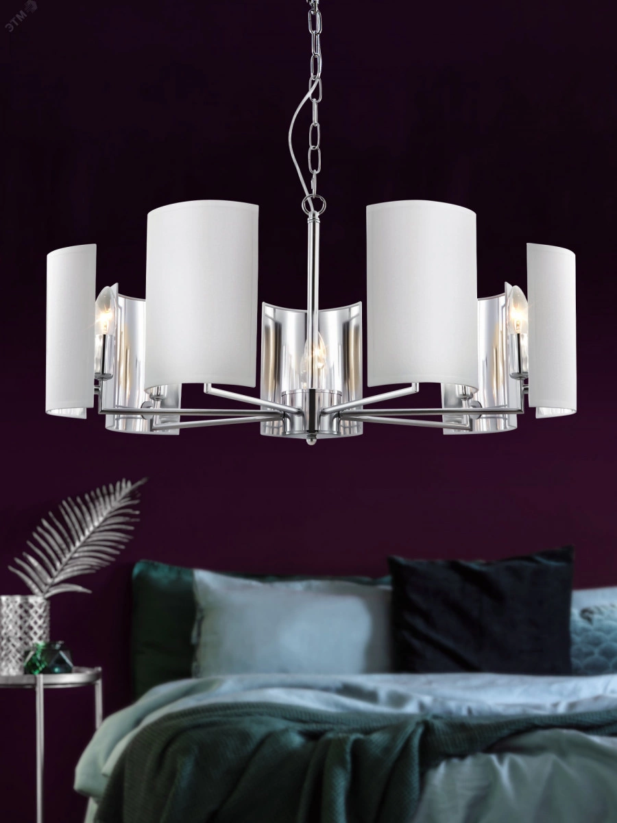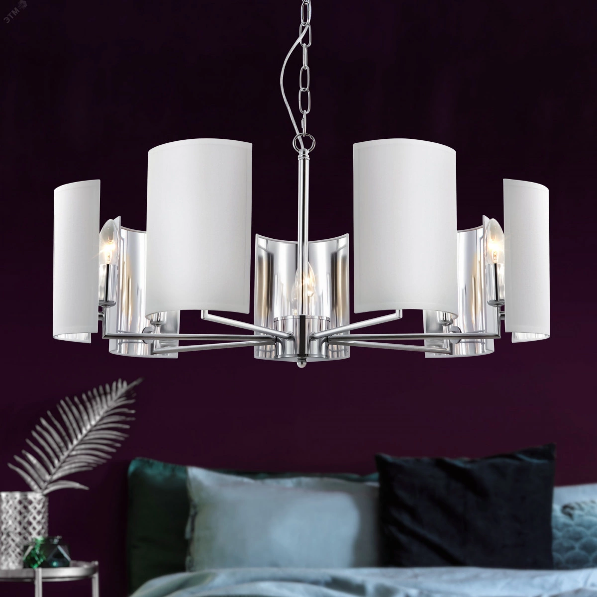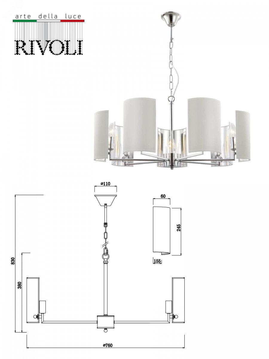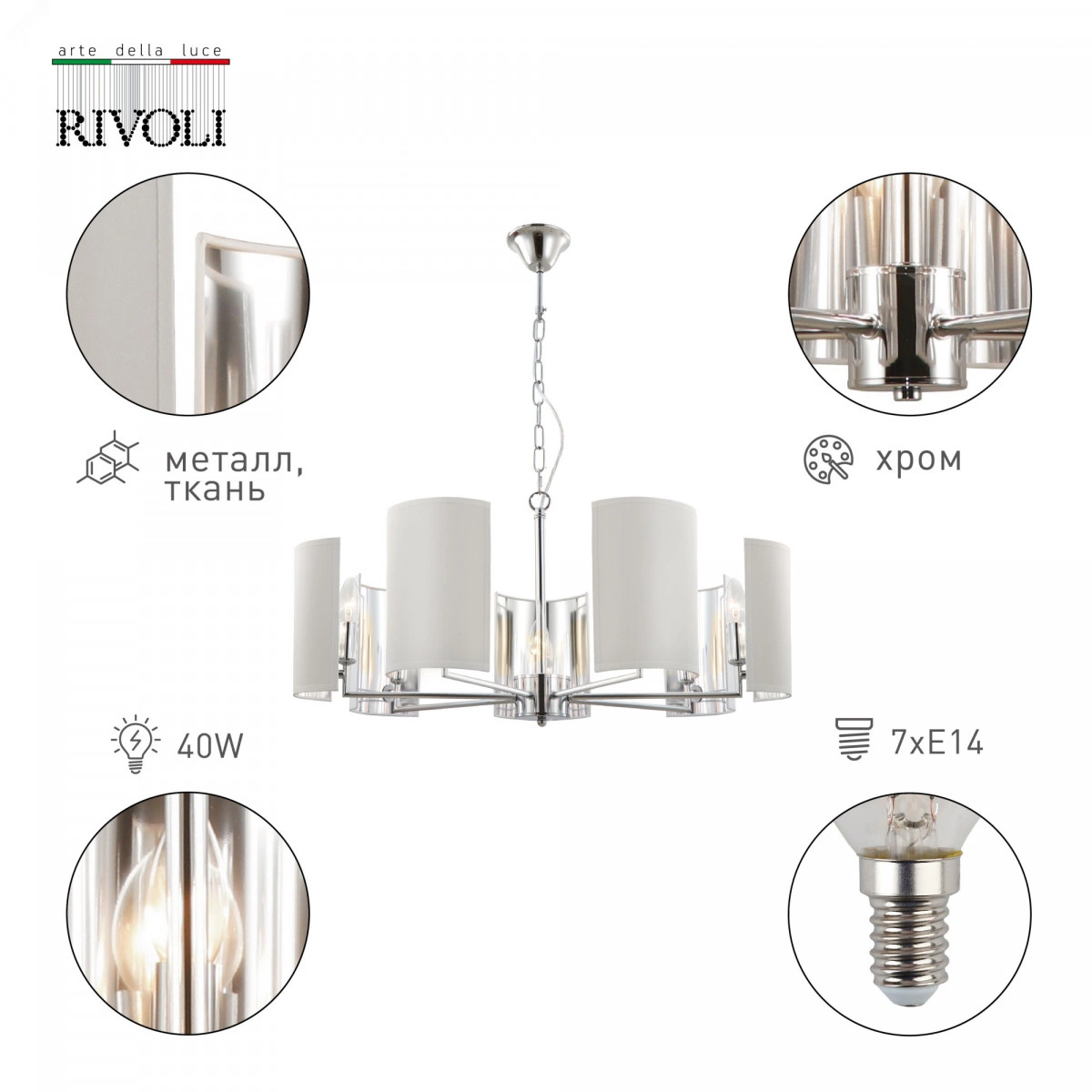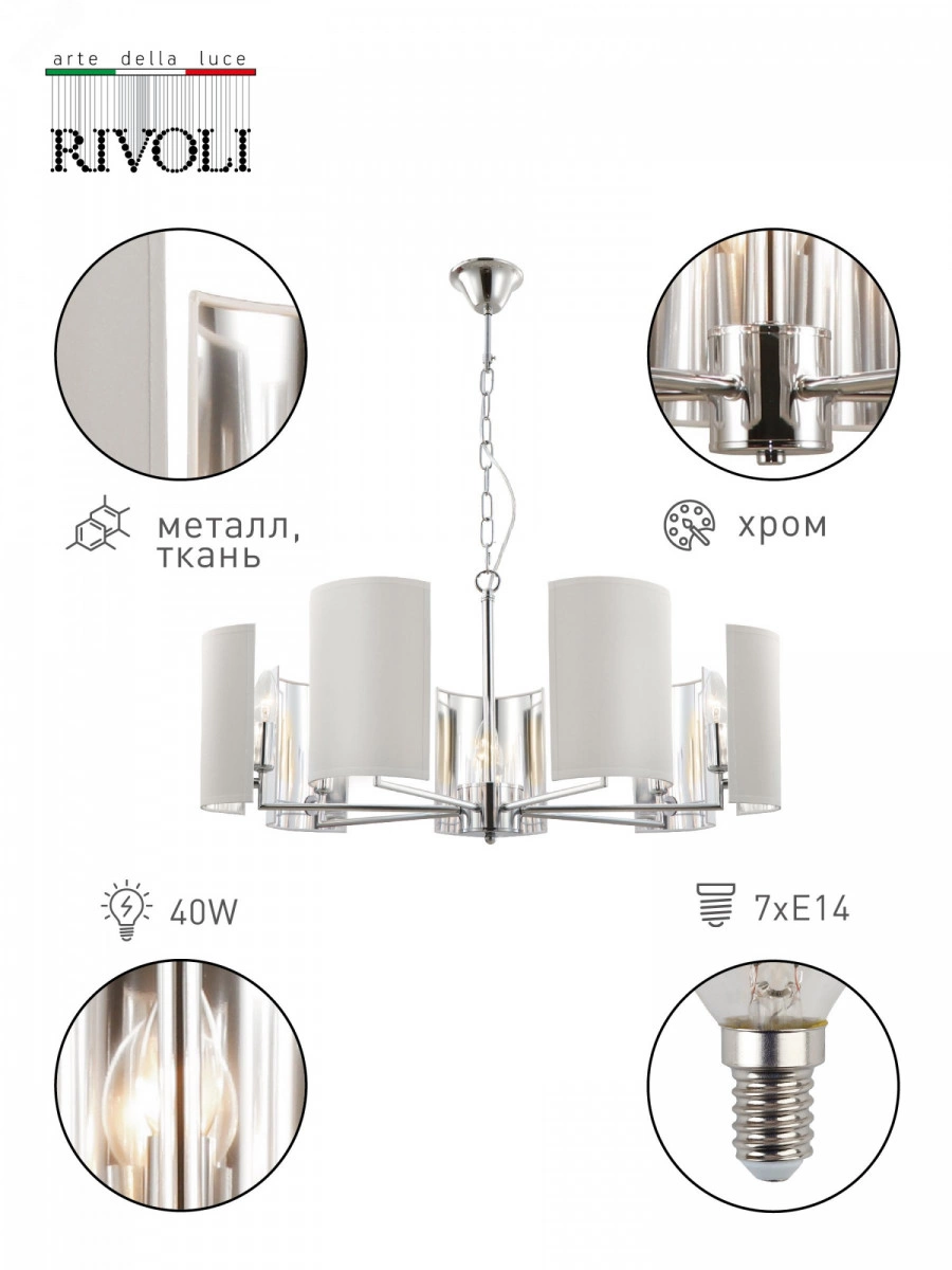 Хромированная минималистичная люстра в стиле современная классика. Люстра потолочная Rivoli Asura (арт. 2076-307) подходит для просторных помещений - применяется с 7 лампами Е14 40 Вт. Для экономии электричества можно установить светодиодные лампочки. В коллекции Rivoli Asura есть аналогичная люстра подвесная под 5 ламп (арт. 2076-305). Коллекцию дополняет бра (арт. 2076-401) и настольный светильник (арт. 7076-501).