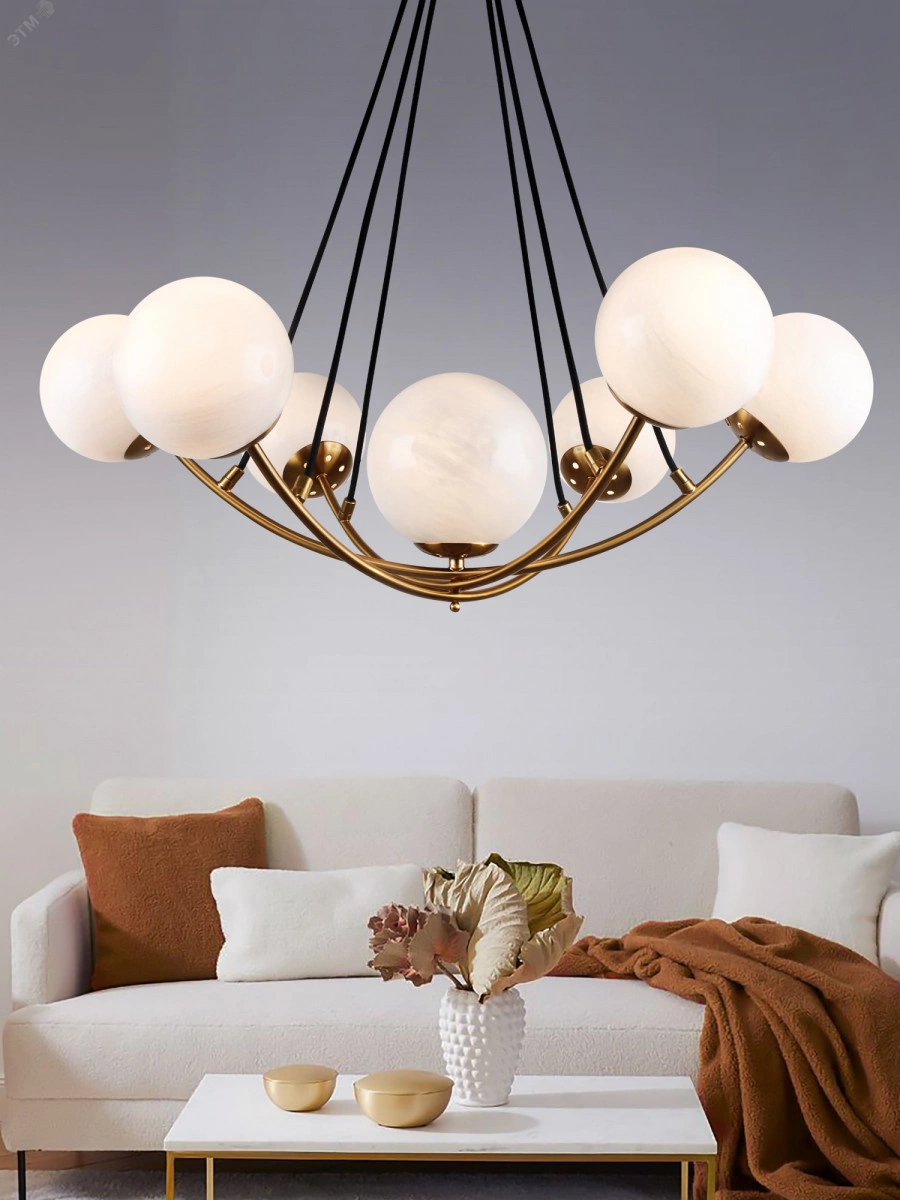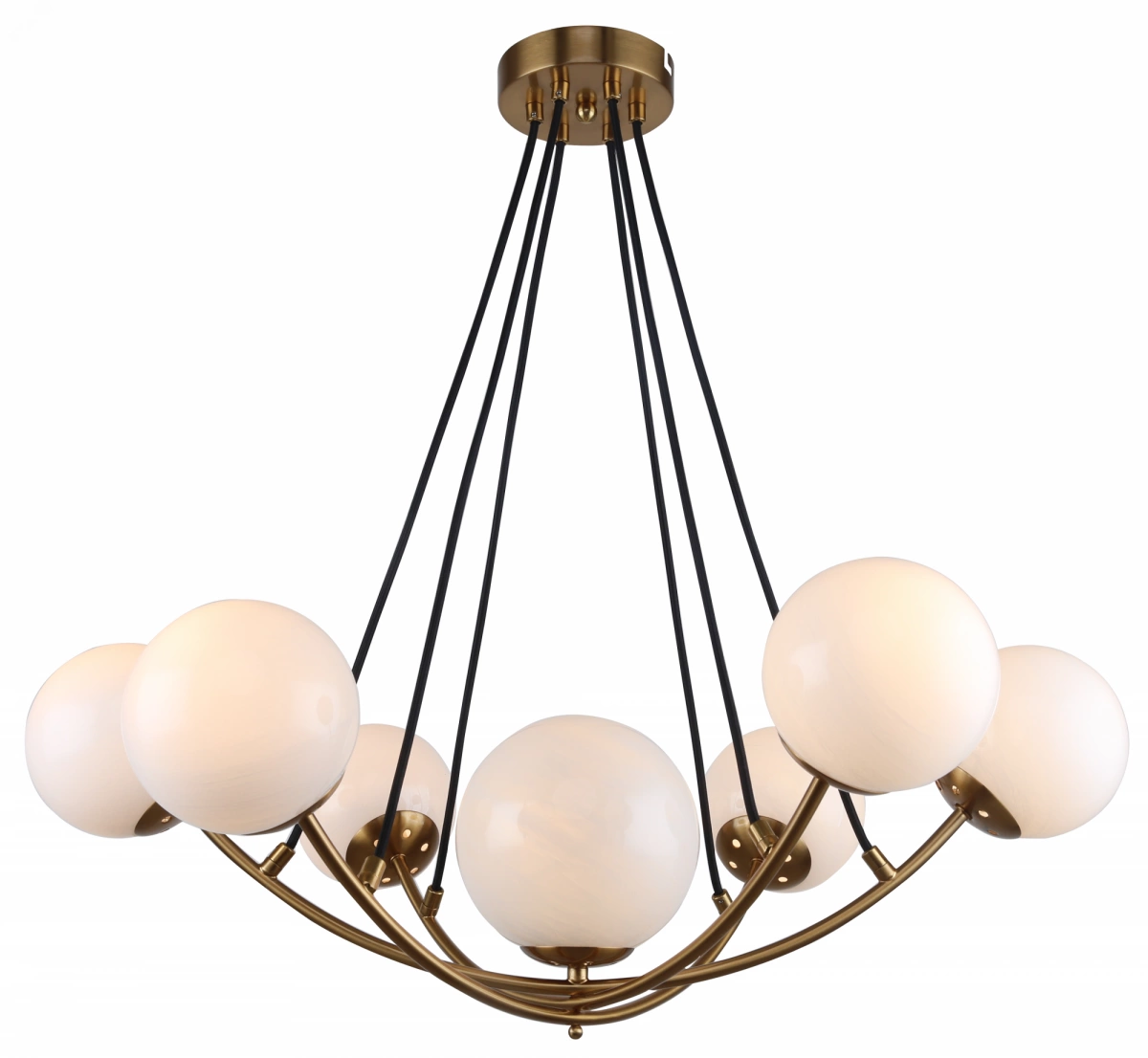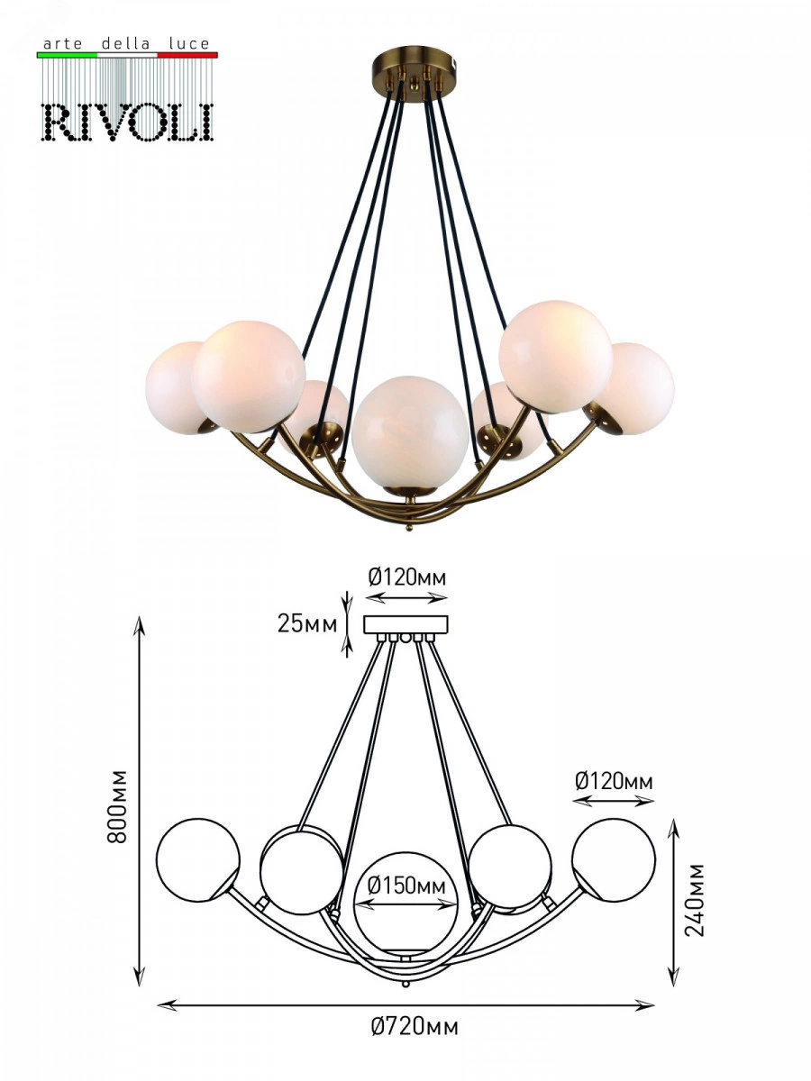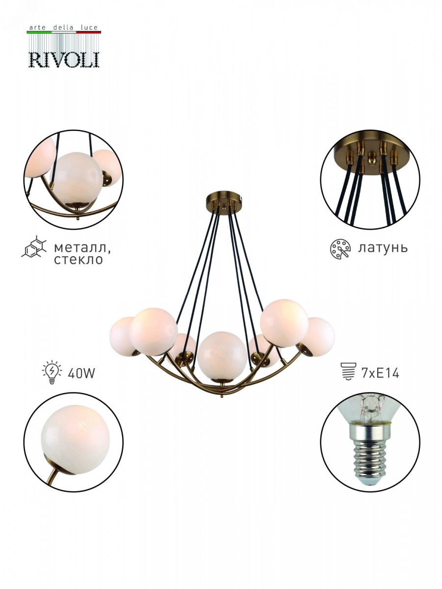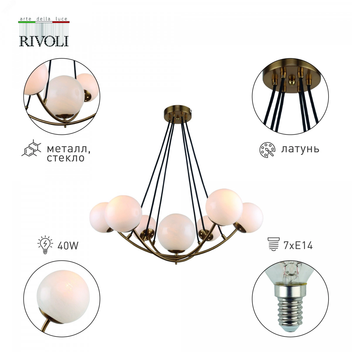 Оригинальная дизайнерская люстра Rivoli Dina под 7 ламп - арт. 4099-307. Подвесные люстры - актуальное решение для современного интерьера. Для люстры Dina нужно купить лампочки Е14 40 Вт, 7 шт. Люстра потолочная Rivoli Dina хорошо осветит площадь 35 м2. Такие люстры идеально подходят в загородный дом, хороши для освещения больших пространств с высокими потолками. Минималистичная арматура люстры окрашена в красивый цвет латуни. Окрашивание гальваническое - люстра сохранит свою красоту на долгие годы.