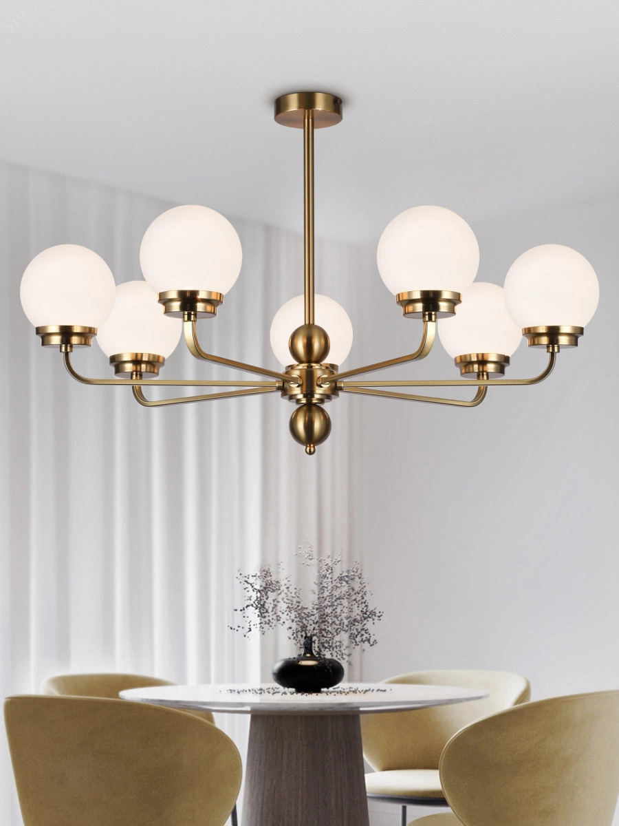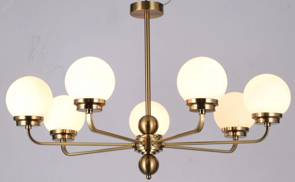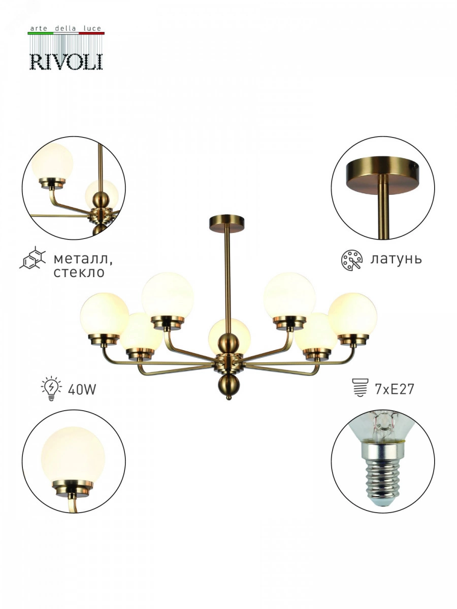 Дизайнерская люстра Rivoli Gayle имеет 7 круглых матовых плафонов из стекла. Эта люстра удачна на потолок большой просторной комнаты. Люстра качественно осветит площадь до 21 м2. Эта потолочная люстра на штанге создает мягкий свет без бликов.