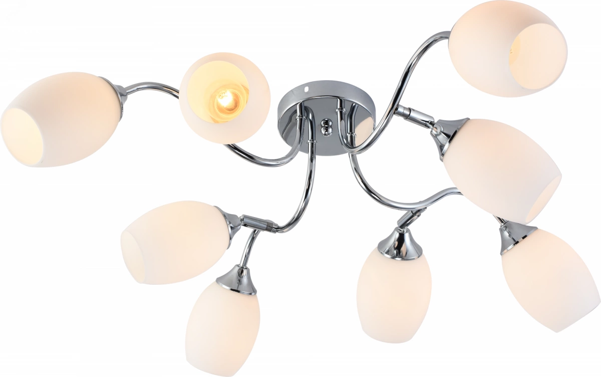Rivoli Hollie (арт. 3135-308) - современная 8-рожковая люстра на потолок со стеклянными плафонами в виде бутонов и хромированной арматурой, напоминающей цветочные веточки. Люстры Hollie - элегантная и эффектная коллекция от итальянского бренда Rivoli. Данная люстра в гостиную с 8 плафонами качественно освещает площадь 24 м2. В коллекции Hollie есть также 6-рожковые люстры потолочные, оптимальные для площади 18 м2. Люстры Hollie Rivoli под 8 ламп Е27 60 Вт стоит купить в просторную спальню, в гостиную. Удачно заказать эти люстры на кухню, совмещенную с гостиной, в квартиру-студию, в загородный дом. Стиль, в котором оформлены эти современные люстры потолочные - модерн. Покрытие трендового цвета хром нанесено гальваническим способом, обеспечивающим стойкость люстры к механическим повреждениям и выцветанию.