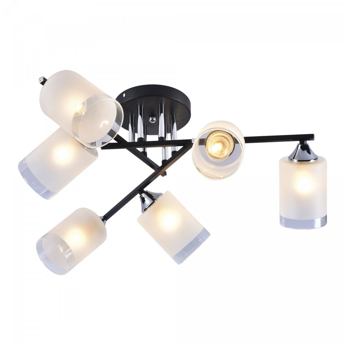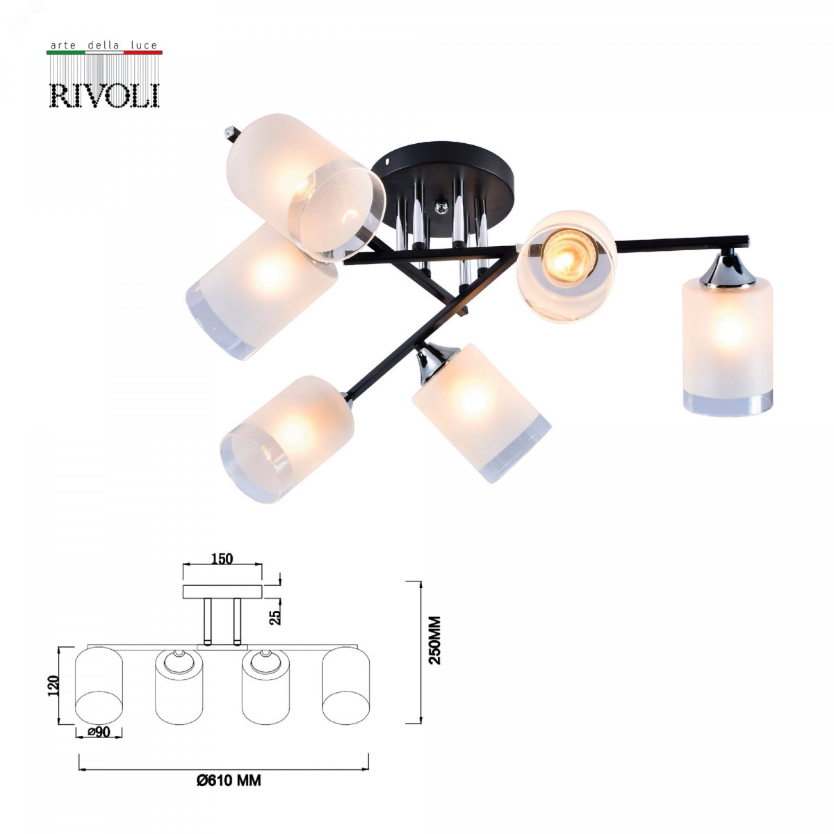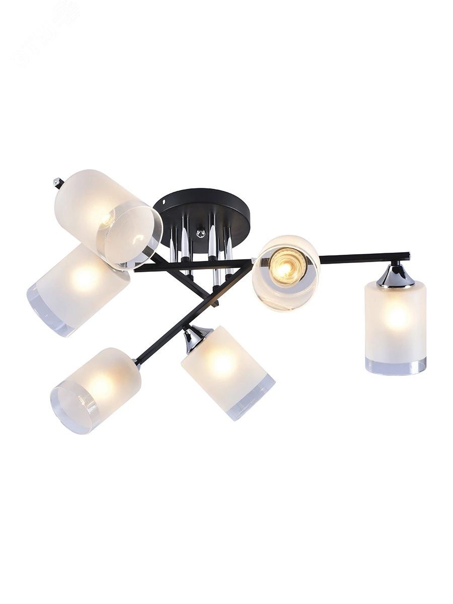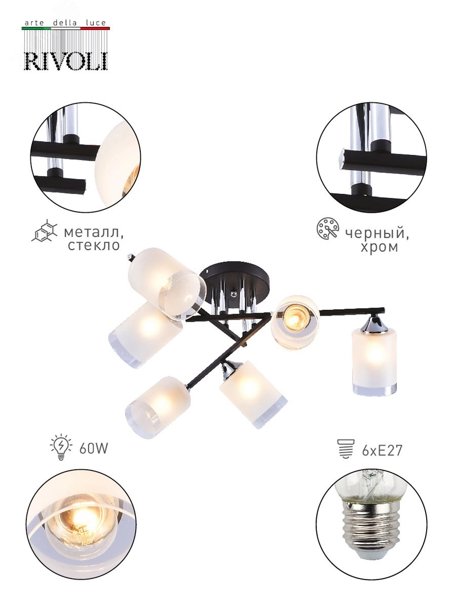 6-рожковая люстра на потолок Rivoli Marielle (арт. 9073-306) создана итальянскими дизайнерами в стремительно набирающем популярность стиле модерн. Такие люстры потолочные из металла и стекла помогут создать уникальный интерьер и уют в вашем доме. Эффектная выверенная арматура люстры состоит из черных металлических реек, оригинально соединяющихся между собой. Темные элементы корпуса люстры дополнены хромированными металлическими деталями. Размер 610*610*250 мм делает эту модель хорошим вариантом люстры на кухню или люстры в спальню.Представляют интерес и плафоны люстры в гостиную Marielle. Изготовленные из матового стекла красивого молочного цвета, в нижней части они имеют элегантный прозрачный ободок. Шесть направленных в разные стороны плафонов под лампы Е27 60 Вт обеспечат вас качественным равномерным светом.