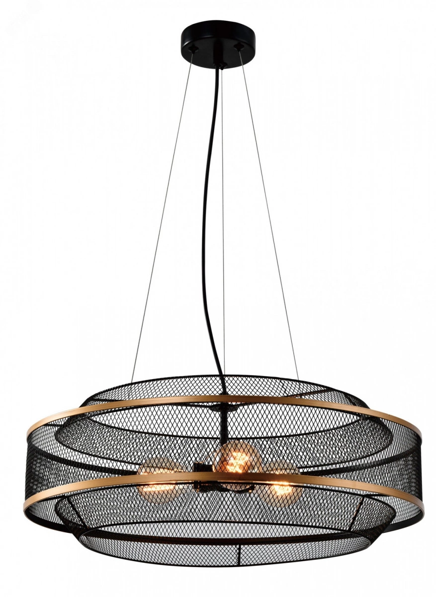 "Rivoli Marika - коллекция современных люстр в стиле лофт-кантри. Главная ""фишка"" - объемный решетчатый абажур из металла. Эффектная мелкая решетка, сочетание матового черного и золотого цветов формируют неповторимый облик светильников Rivoli Marika. Металл имеет стойкое гальваническое покрытие, что защищает светильники потолочные Marika от механических воздействий и выцветания. Металл легкий и прочный. Дизайн создан командой итальянского бренда Rivoli. Данная модель - подвесной светильник для высоких или средних потолков. Высота подвеса регулируется при монтаже. Применяется с 3 лампами Е27 40 Вт. Освещает 9 м2. Купить этот металлический светильник стоит на кухню, в гостиную. Хорошо смотрится над столом."
