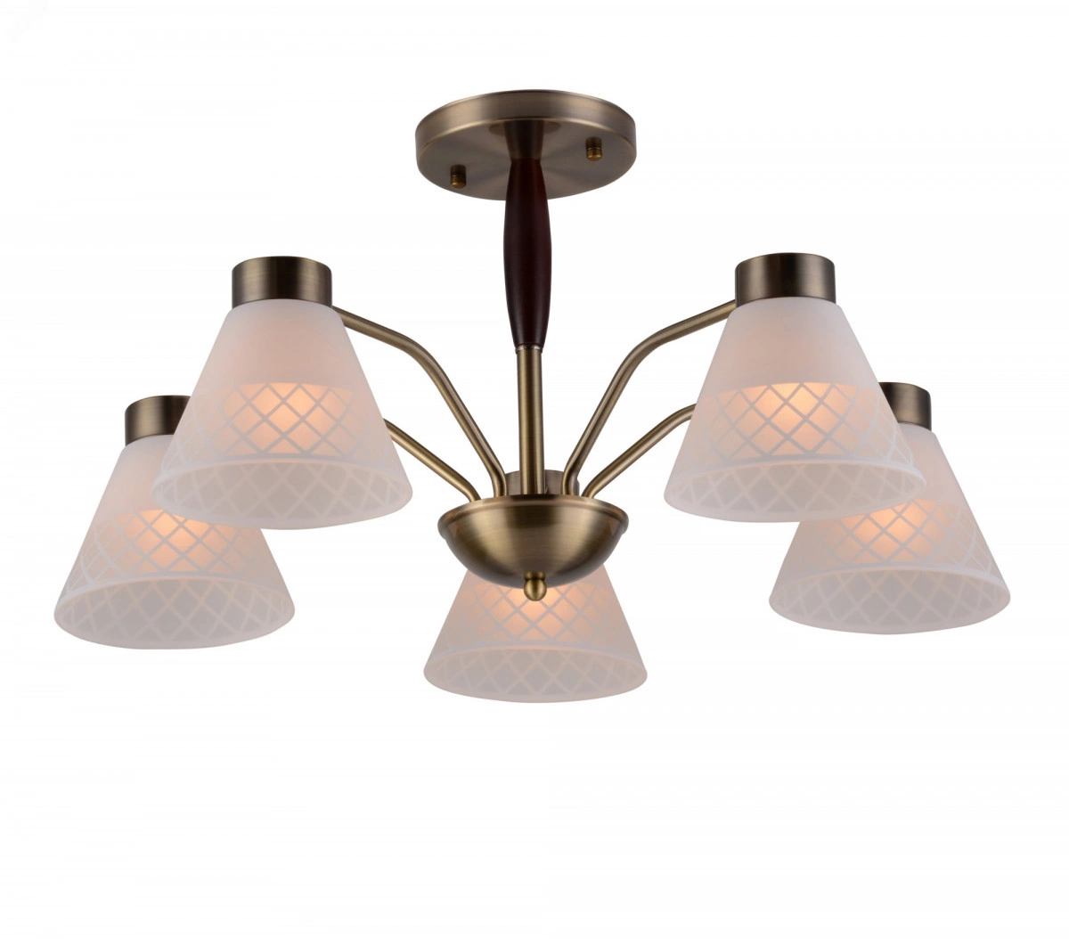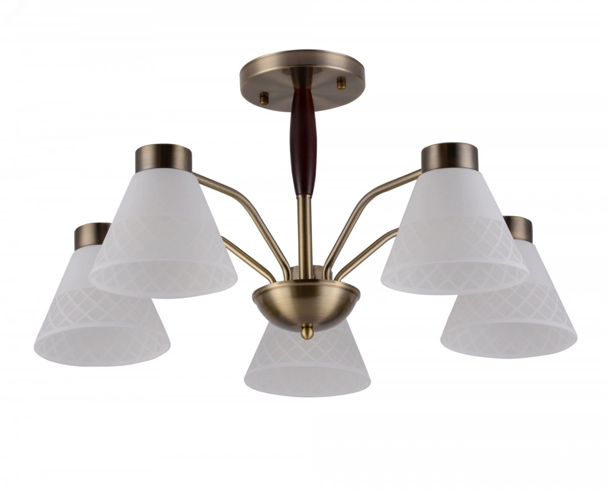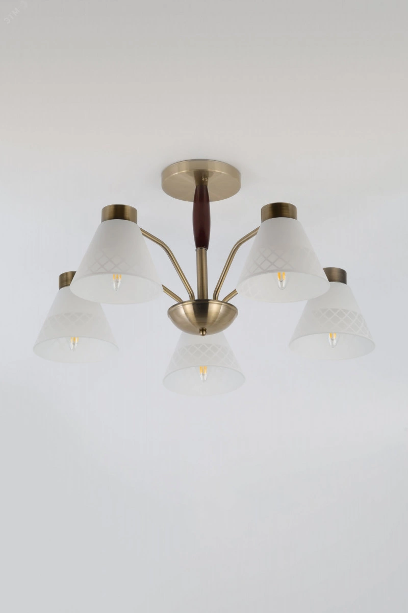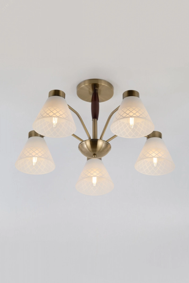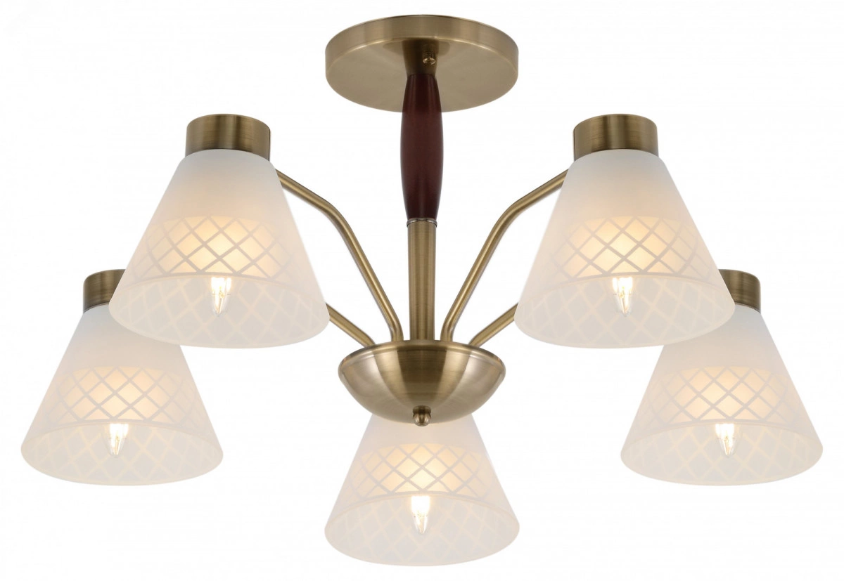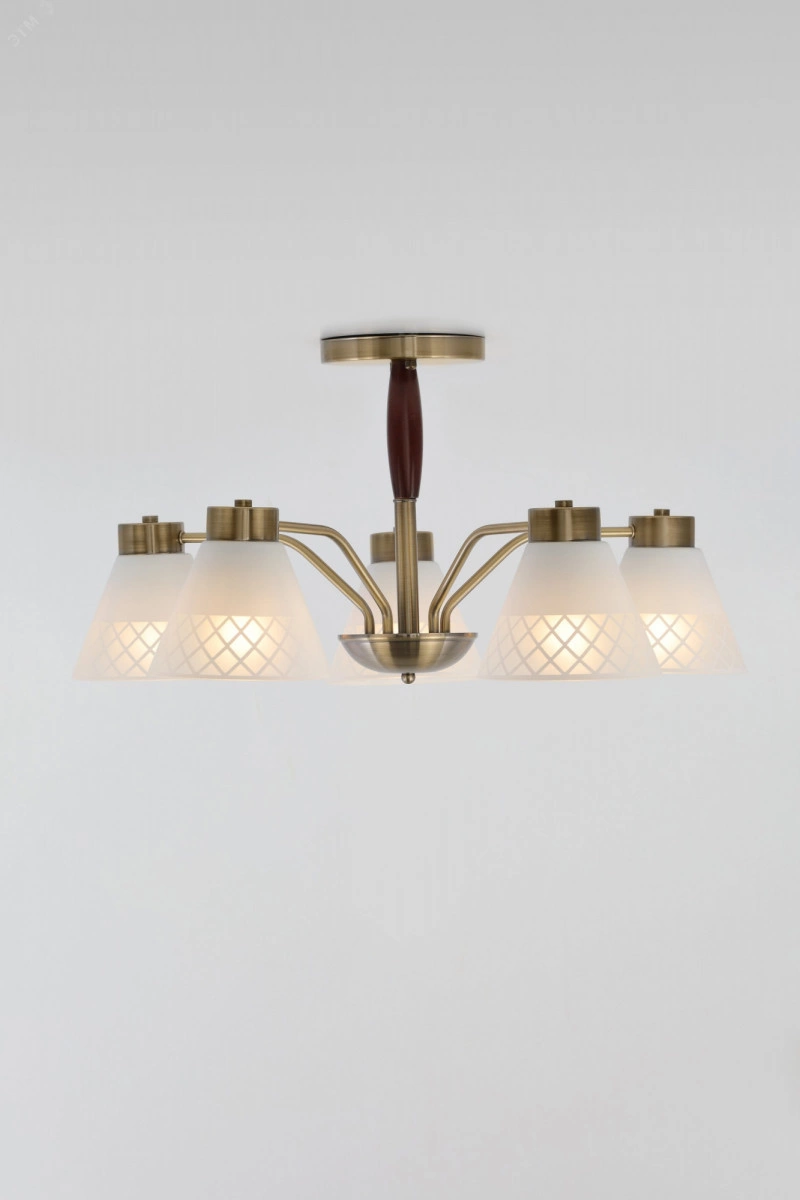Люстры на потолок Rivoli Meta яркий пример современного подхода к классическому стилю. Арматура лаконичного исполнения окрашена в цвет античная бронза. Матовые стеклянные плафоны этой универсальной люстры украшены геометричным рисунком. У основания деревянный элемент благородного темно-коричневого оттенка. Люстры потолочные Rivoli Meta созданы в сочетании сдержанности и легкой футуристичности. Это делает их беспроигрышным решением для интерьеров в самых разных стилях от замковой классики до модного лофта. 5-рожковая люстра с равномерным расположением ламп по кругу традиционный вариант для гостиной, спальни, столовой, кухни, загородного дома, квартиры-студии. Устанавливайте в Rivoli Meta лампы с самым распространенным цоколем Е27. Мощность по 40 Вт.