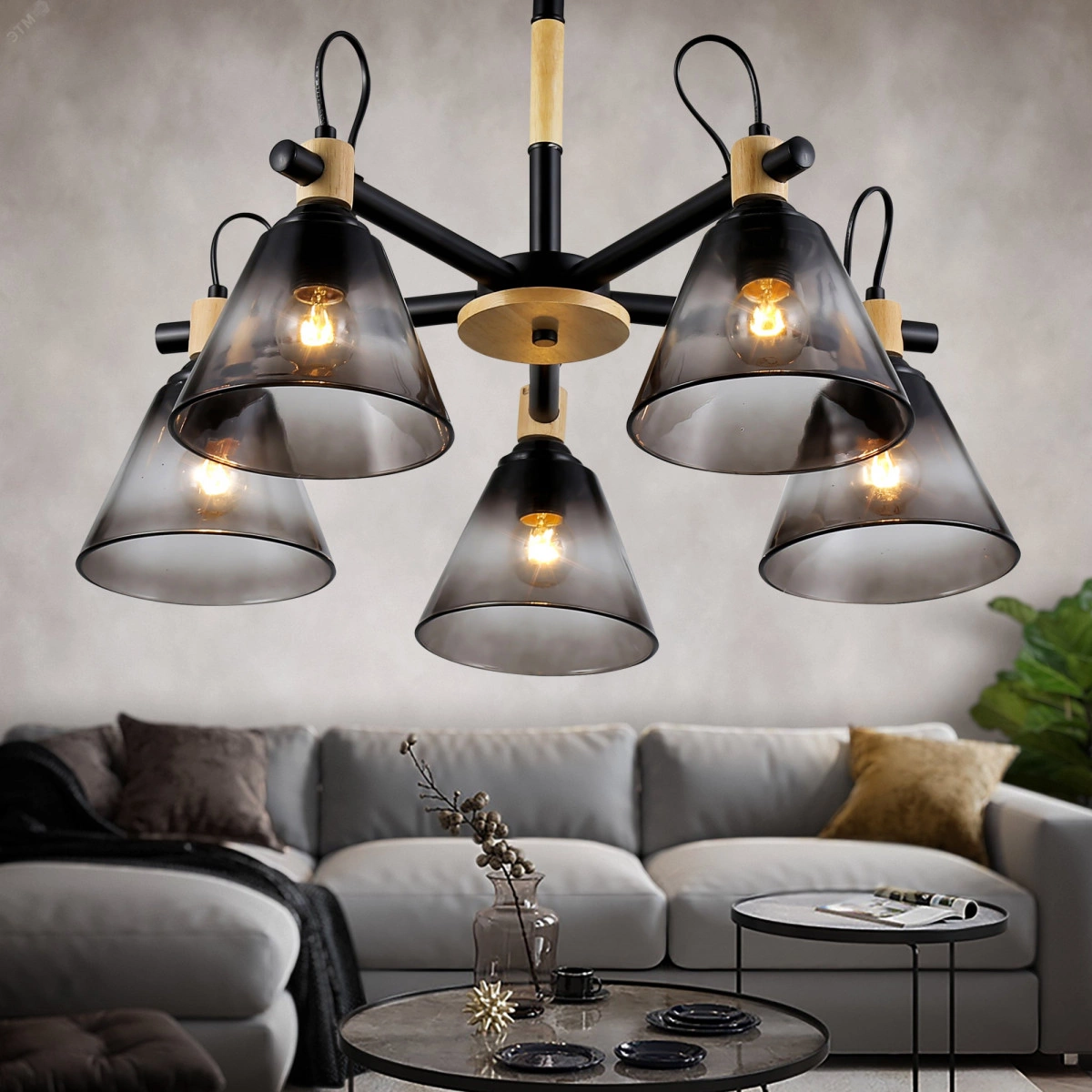 Elmira - дизайнерские люстры из металла, дерева и стекла. Выполнены в стиле лофт-кантри и отлично подходят для популярных интерьеров. Созданы итальянским брендом Rivoli. Стеклянные тонированные плафоны люстры - одна из изюминок коллекции. Люстры Rivoli Elmira будут удачны для интерьеров в стиле лофт, кантри, модерн, подойдут эти люстры в гостиную в скандинавском стиле. В каркасных люстрах Rivoli Elmira немало интересных деталей. Элементы светлого дерева в контрасте с черным матовым металлом создают неповторимый внешний вид люстры. Арматура люстры проста и минималистична. Плафоны имеют глубокую сложную тонировку, есть эффектный декоративный вывод провода над плафонами. Для люстры на потолок Elmira подойдут лампы распространенного цоколя Е27, мощность - 40 Вт. Данная люстра 5-рожковая качественно осветит площадь 15 м2.