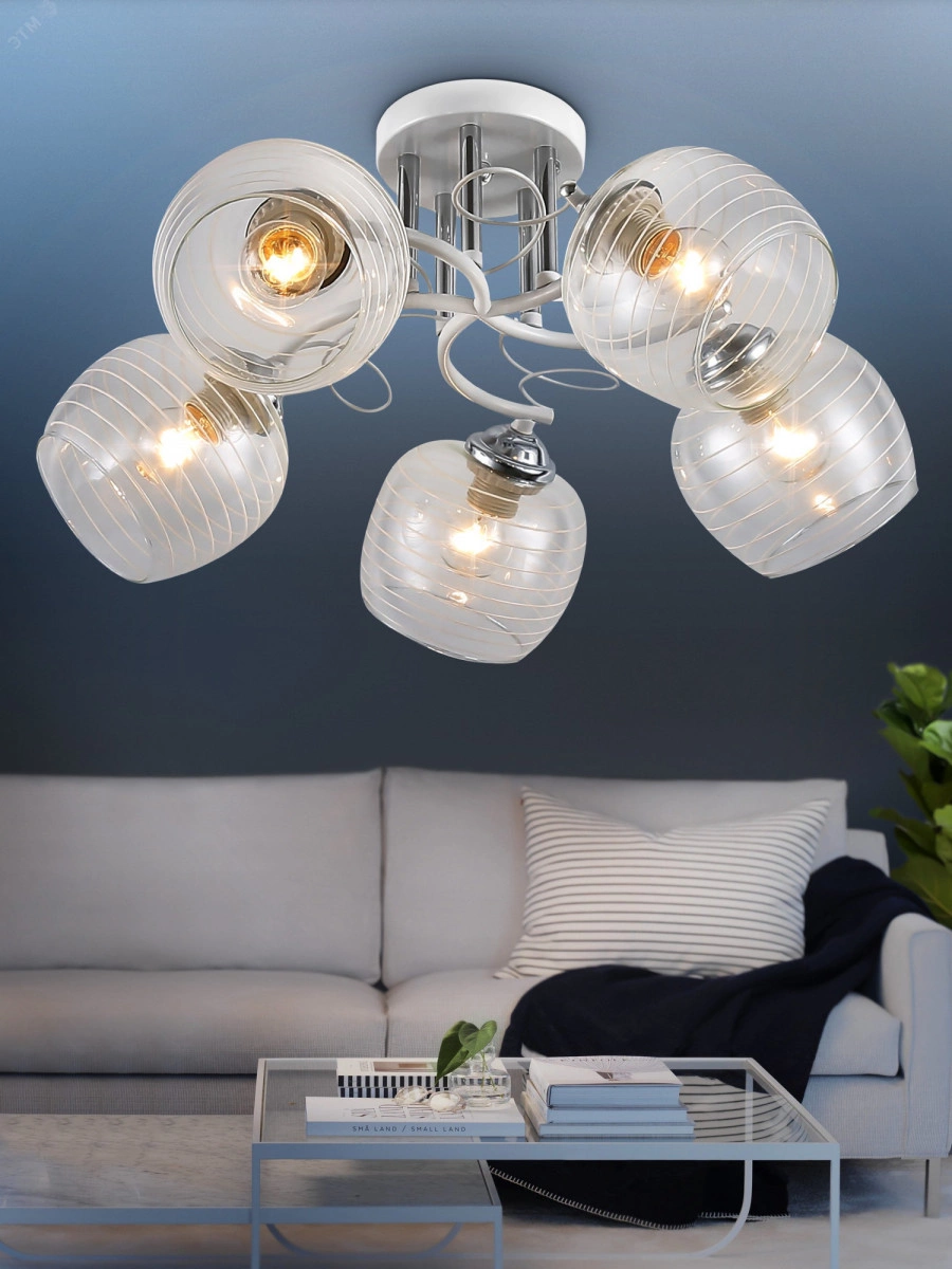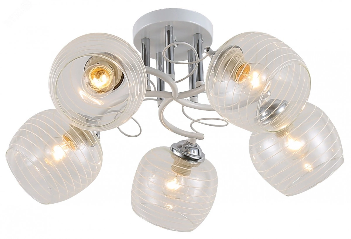 Estefany - люстры потолочные, созданные итальянским брендом Rivoli как универсальное решение преобразить стандартное жилое помещение. Эти красивые люстры освещают помещение площадью от 15 м2 и используются с 5 популярными лампочками Е27 мощностью 40 Вт. Купить Rivoli Estefany стоит в качестве люстры на кухню, люстры в спальню, люстры в гостиную. У вас есть возможность заказать люстры с качественным равномерным светом и эффектным дизайном по доступной цене. Металлический корпус окрашен в стильный белый цвет в сочетании с хромом, прозрачные стеклянные плафоны декорированы узором в виде полос.Rivoli Estefany красивая и практичная люстра не невысокий или средний. В коллекции вы найдете модели под 3 и 5 ламп, а также бра под 1 лампу.
