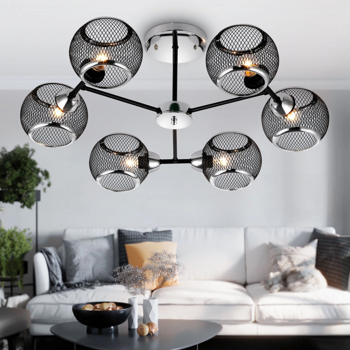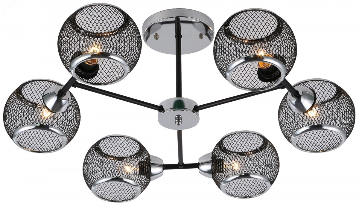 Rivoli Morrigan (арт. 9143-306) - люстра на потолок с 6 металлическими сетчатыми плафонами округлой формы. Такие люстры - популярное решение для современных интерьеров. Плафоны из легкого прочного металла базового черного цвета расположены по кругу, лампочки эффектно направлены в сторону. Люстра в гостиную Morrigan Rivoli отлично распределяет свет в комнате, создает эффектные световые узоры за счет решетчатой структуры плафонов. Шесть источников света - оптимальное решение для люстры в жилую комнату. Рекомендованные лампы для данной люстры в спальню, люстры на кухню - Е27 40 Вт.
