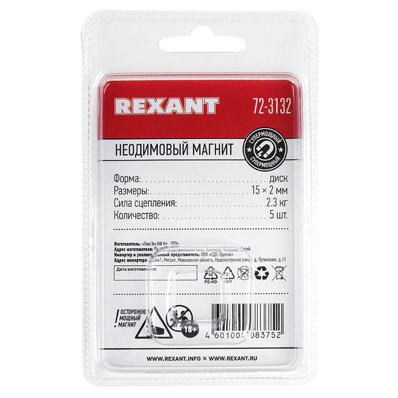Магнит неодимовый диск 15х2мм сцепление 2.3 кг (блист.5шт) Rexant 72-3132