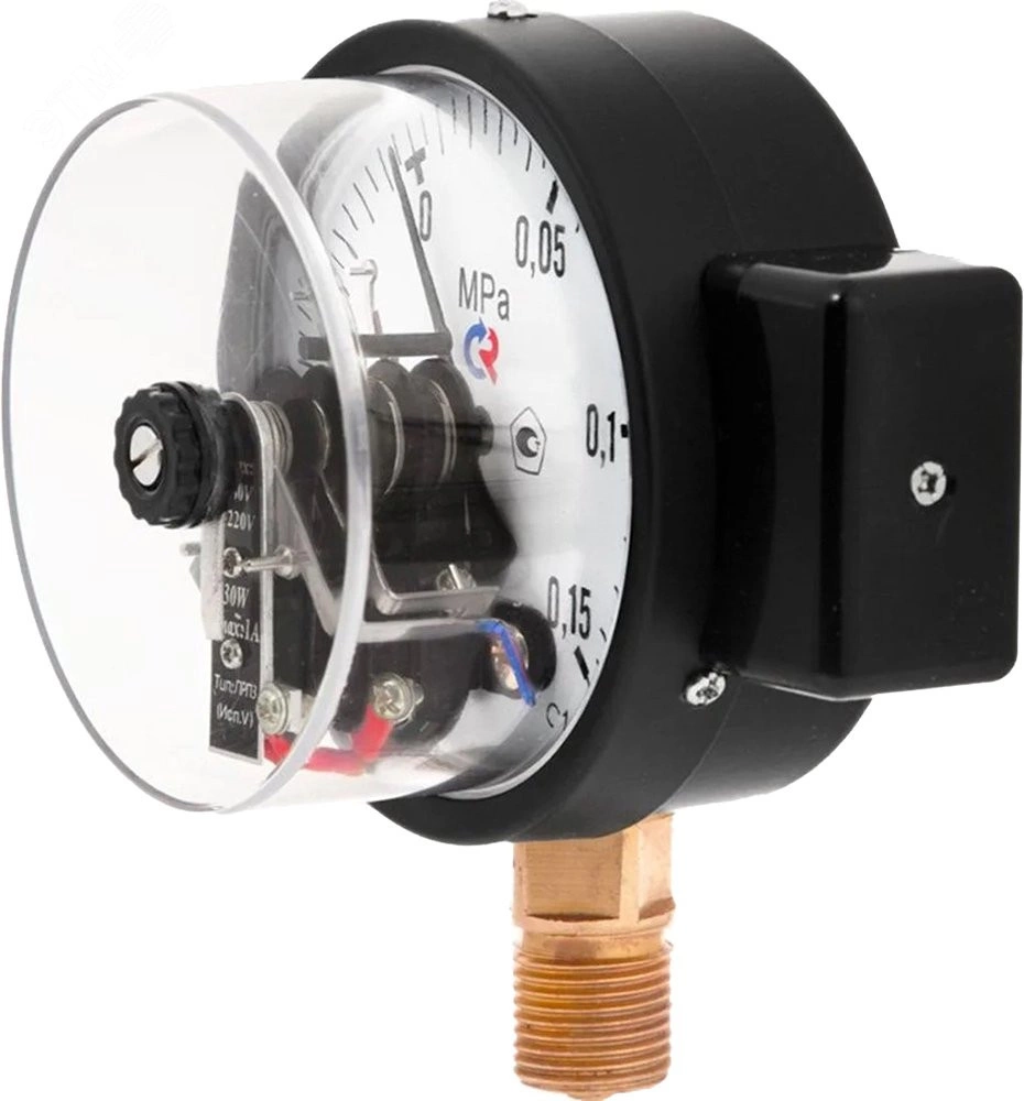 Манометр с электроконтактной приставкой предназначен для управления внешними электрическими цепями в схемах сигнализации, автоматики и блокировки технологических процессов. Электроконтактная группа манометра снабжена указателями, осуществляющими настройку приставки на пороговое значение (значение уставки), а группа приставки механически связана со стрелкой показывающего прибора. При прохождении стрелкой значения уставки происходит замыкание или размыкание (в зависимости от типа приставки) электрической цепи. Область применения: теплоснабжение, водоснабжение, вентиляция, машиностроение.