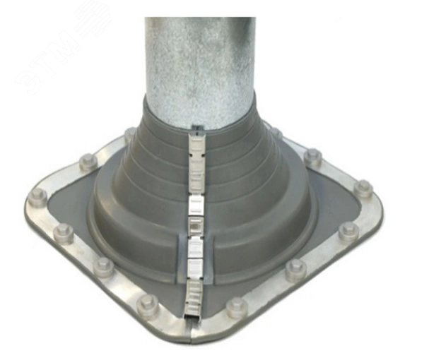 Манжета сделана из атмосферно-стойкого полимера EPDM. В ее составе гофрированная труба, отлитая заодно с квадратным основанием. Для фиксации на крыше/стене в опорную часть изделия интегрирована алюминиевая рамка. Опора – квадратной формы с полукруглыми краями. Эластичная манжета не препятствует тепловому расширению трубопроводов и элементов фасадной отделки.