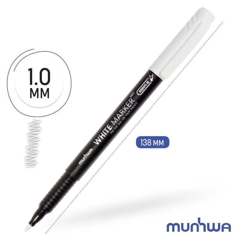 Перманентный маркер с чернилами белого цвета отлично подходит для нанесения маркировки на большинство поверхностей: метал, стекло, пластик, дерево, бумага и т.д. Чернила обладают совйствами высокой укрывистости, светостойкости, непрозрачности, нетоксичны (не содержат ксилол и толуол). Время высыхания 15 секунд (зависит от типа поверхности). Длина непрерывной линии 250 метров (зависит от типа поверхности). Вес чернил 1,5 грамма. Диаметр пишущего узла 2,45мм