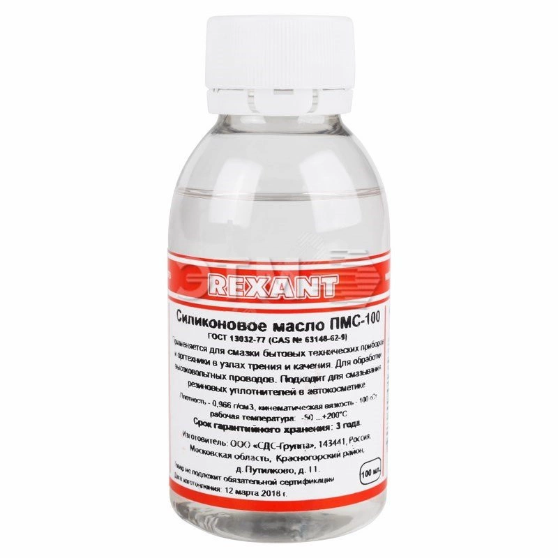 "ПолиМетилСилоксановая жидкость ПМС-100 (ГОСТ 13032-77) REXANT — бесцветная прозрачная химически инертная и коррозионностойкая силиконовая жидкость без запаха. В отличие от минеральных или синтетических масел, данная жидкость обладает превосходными электроизоляционными, антиадгезионными и пеногасящими свойствами. Область применения - Для смазки резиновых уплотнений и обработки высоковольтных проводов. На производстве при эксплуатации пресс-форм РТИ и пластмасс, для образования разделяющего действия между разными поверхностями (металл-пластик, пластик-резина и т. п.). Как добавка в политуры и различные средства бытовой химии. В форме гидравлической, амортизационной или демпфирующей жидкости. "