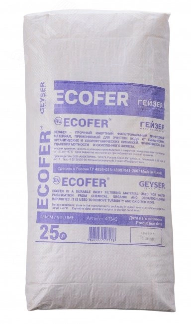 Экофер 0.7 - 2.0 - синтетический гранулированный каталитический алюмосиликатный фильтрующий материал, изготовленный из природного сырья. Экофер используется для комплексной очистки воды до нормативов СаНПиН. Водоподготовки для бассейнов, работы с окислителями, и наличием сероводорода в исходной воде. При прохождении воды через EcoFER железо Fe+ и марганец Mn2+, растворенные в воде, образуют осадок (гидроксиды железа и марганца), который задерживается в толще загрузки. Для восстановления его фильтрующей способности (регенерации) не требуются химические реагенты - достаточно обратной промывки.