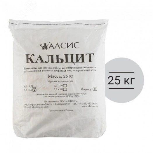 Природный фильтрующий материал кальцит на основе карбоната кальция предназначен для повышения рН исходной воды перед ее подачей на фильтры обезжелезивания. При использования кальцита требуется периодическая обратная промывка фильтрующей загрузки, которая предотвращает цементирование и уплотнение. Фильтр с кальцитом устанавливают, как правило, перед установкой умягчения воды, поскольку материал увеличивает жесткость воды.