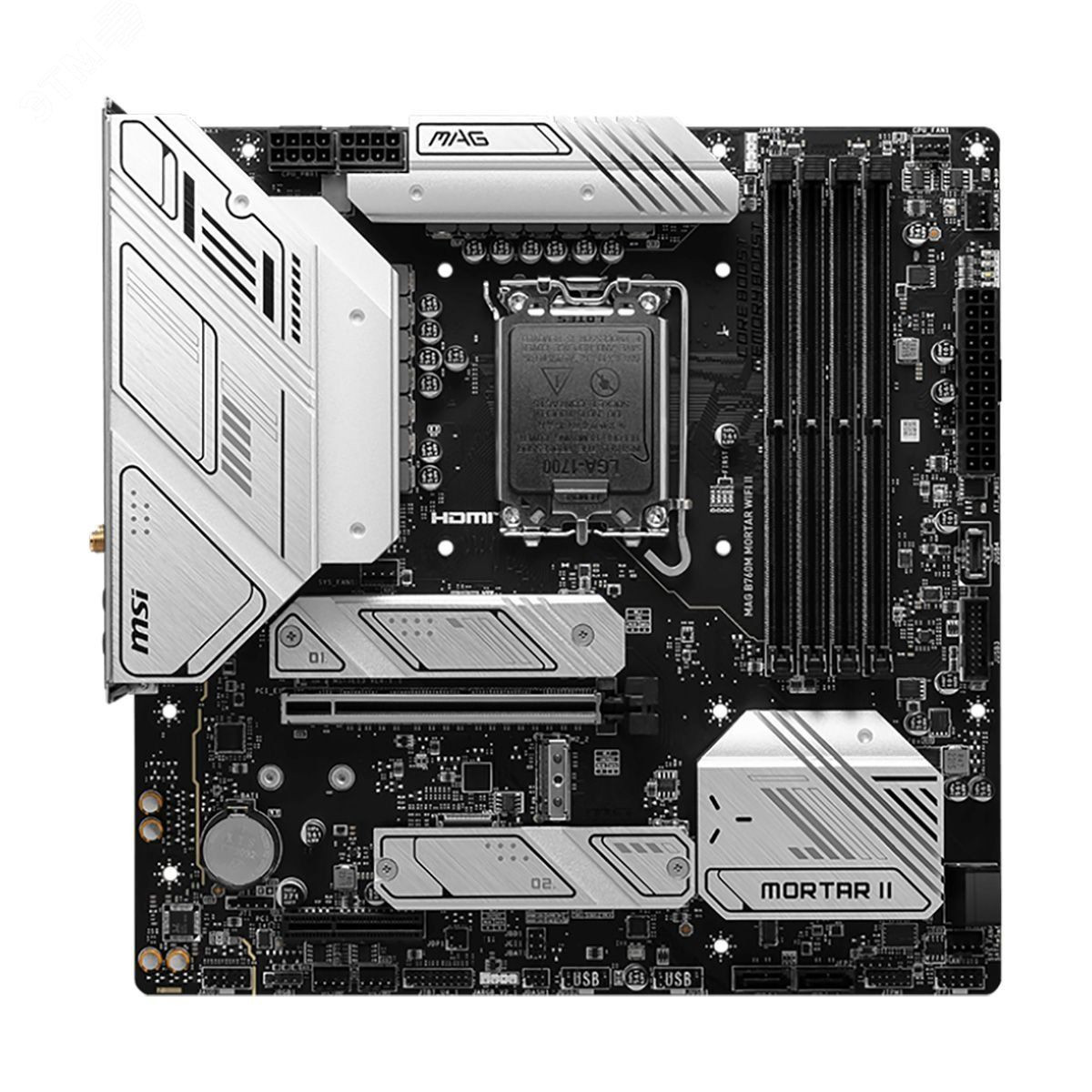 Материнская плата MSI MAG B760M MORTAR WIFI II - это отличное решение для сборки мощного и функционального игрового компьютера. Она поддерживает процессоры Intel Core 12-го и 13-го поколений и оперативную память DDR5. Плата имеет четыре слота для памяти, которые поддерживают максимальный объём до 64 ГБ. MSI MAG B760M MORTAR WIFI II оснащена одним слотом PCI-E x16 и двумя слотами PCI-E x1. Также имеется три порта M.2 для установки высокоскоростных накопителей. Шесть портов SATA позволяют подключить традиционные жёсткие диски и SSD. Плата имеет компактный размер (244 x 244 мм) и форм-фактор Micro-ATX, что делает её идеальным выбором для небольших корпусов. В комплект входят Wi-Fi-антенна и два кабеля SATA.